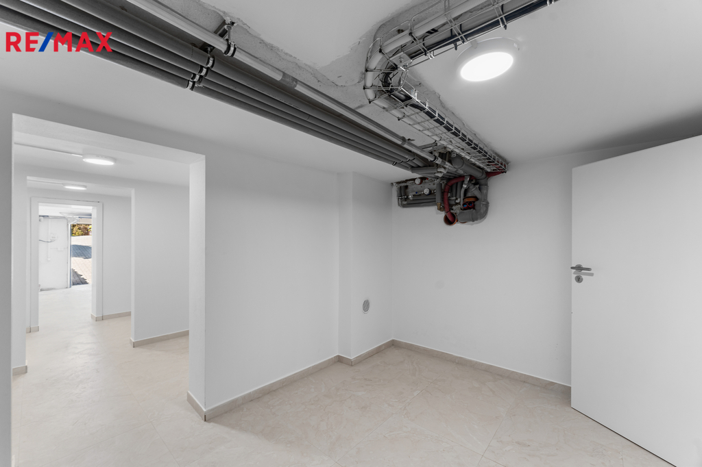 Vnitřním schodištěm je s bytem propojen suterén s velkým prostorem jak pro skladování tak například pro vybudování menšího domácího wellness. Na něj navazuje velká garáž s vraty na dálkové ovládání (stejně tak je dálkově ovládaná brána).