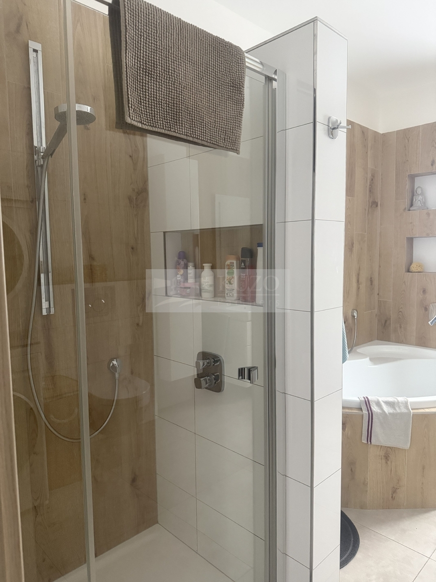 Koupelna byla vybavena špičkovými podomítkovými zařizovací předměty Hans Grohe. Najdete tu vanu i sprchový kout, dále WC a místo pro pračku i sušičku. I přes to vše, je zde stále dost volného prostoru a místnost nepůsobí přeplněně.