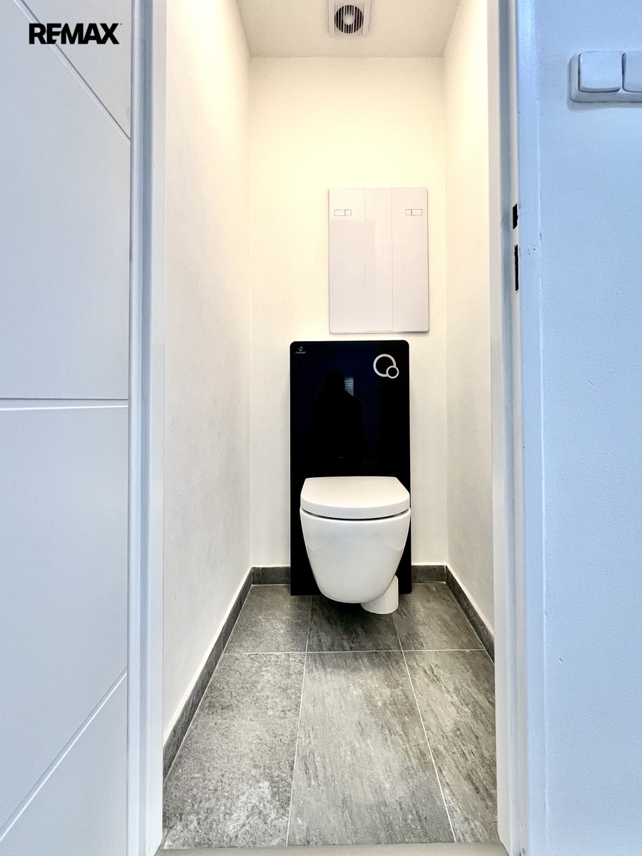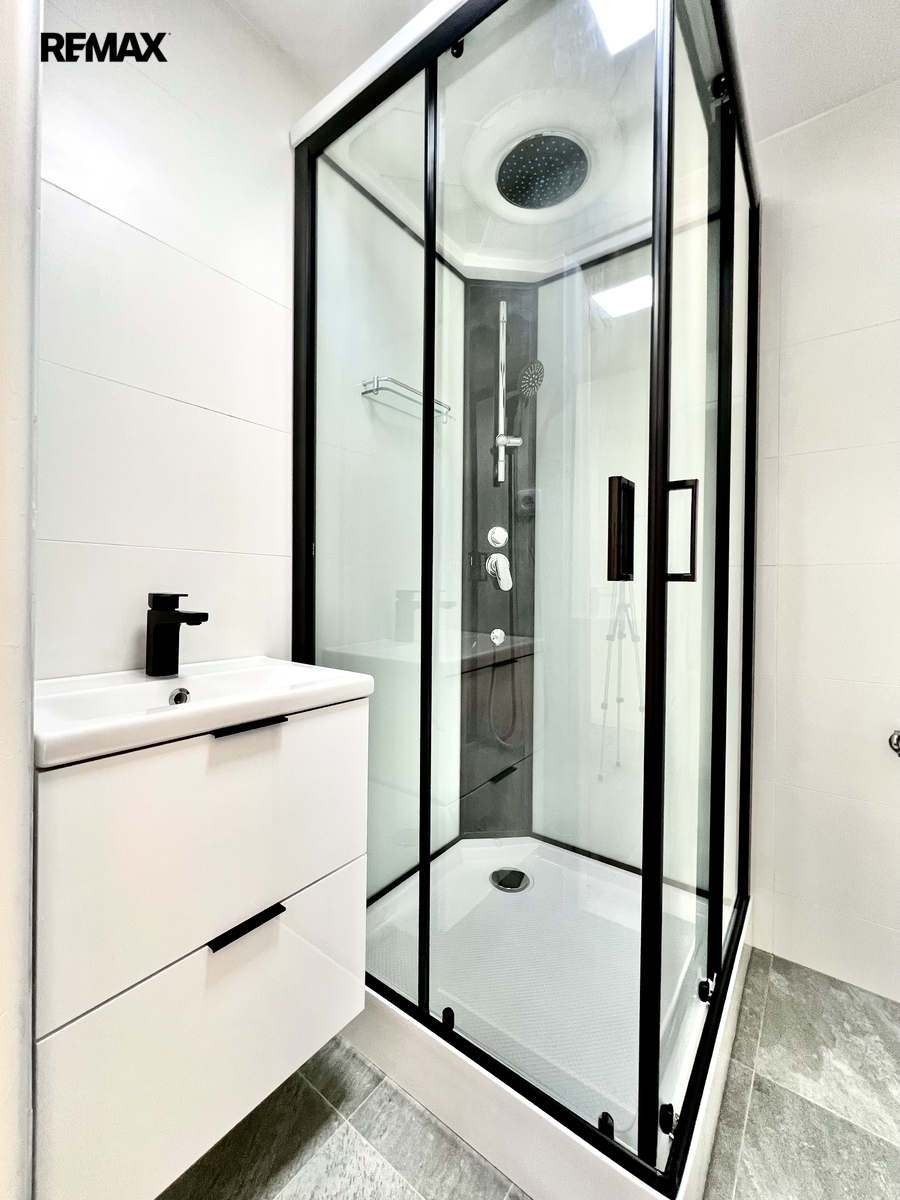 Koupelna & WC: Moderní koupelna se sprchovým koutem a samostatné nové WC.