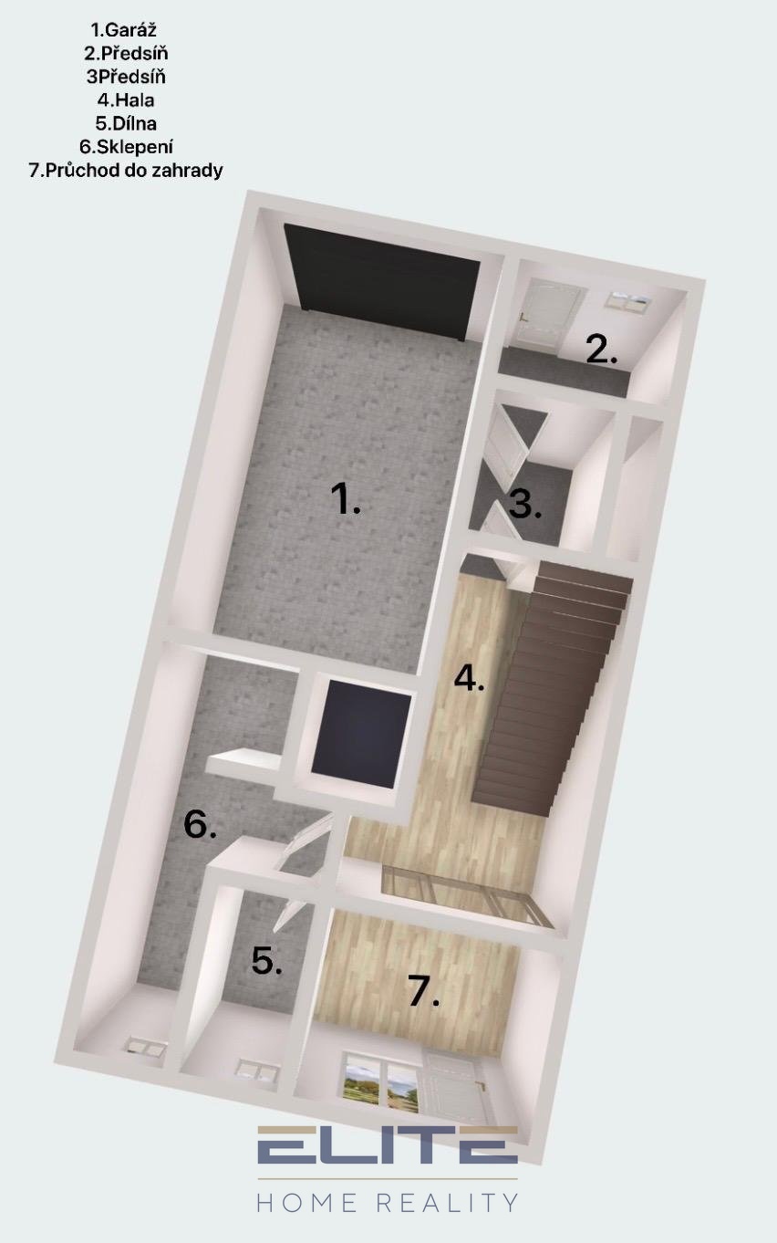 V přízemí najdete garáž s technickým zázemím, které přirozeně doplňuje praktickou stránku každodenního fungování domu, dále pak verandu se vstupem na zahradu, která nabízí dostatek prostoru pro rodinný život, odpočinek i zahradničení.