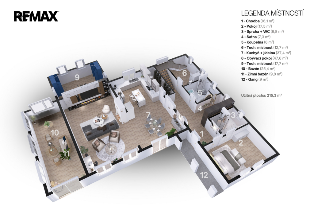 Zastavěná plocha přibližně 270 m² a podlahová plocha přesahující 230 m² poskytují dostatek prostoru i pro početnější rodinu nebo náročné uživatele, kteří ocení vzdušnost a variabilitu interiéru.