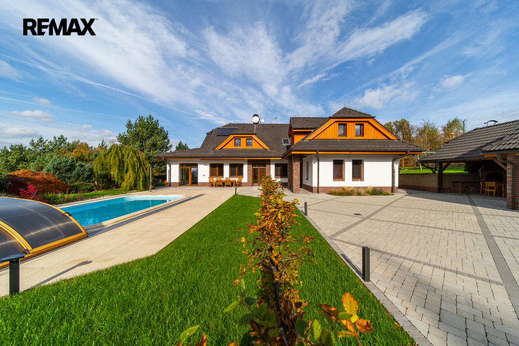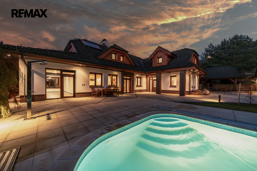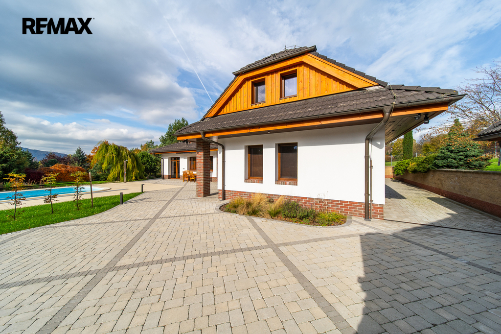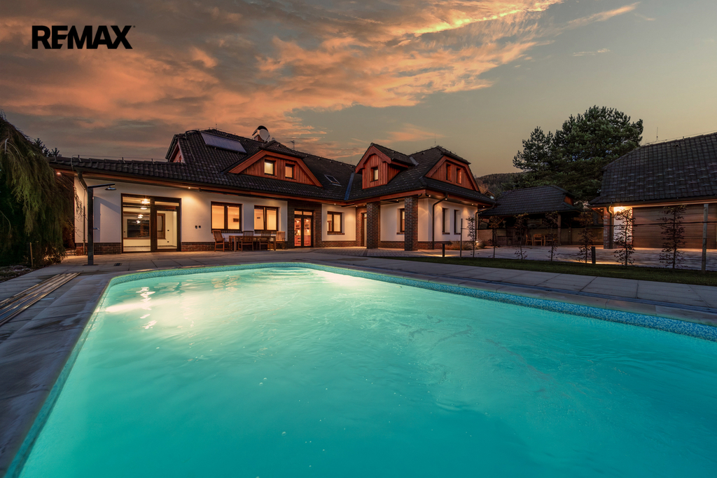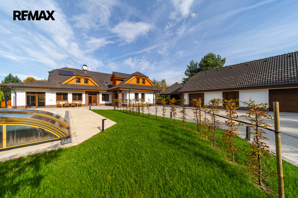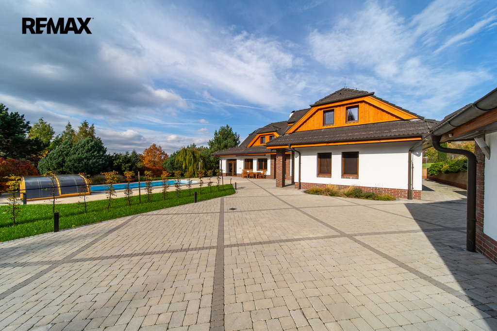 Rozsáhlé zpevněné plochy, terasa a připravený prostor pro bazén podtrhují charakter skutečného rodinného sídla. Pozemek poskytuje soukromí, otevřené výhledy do okolní krajiny a přímý kontakt s přírodou.