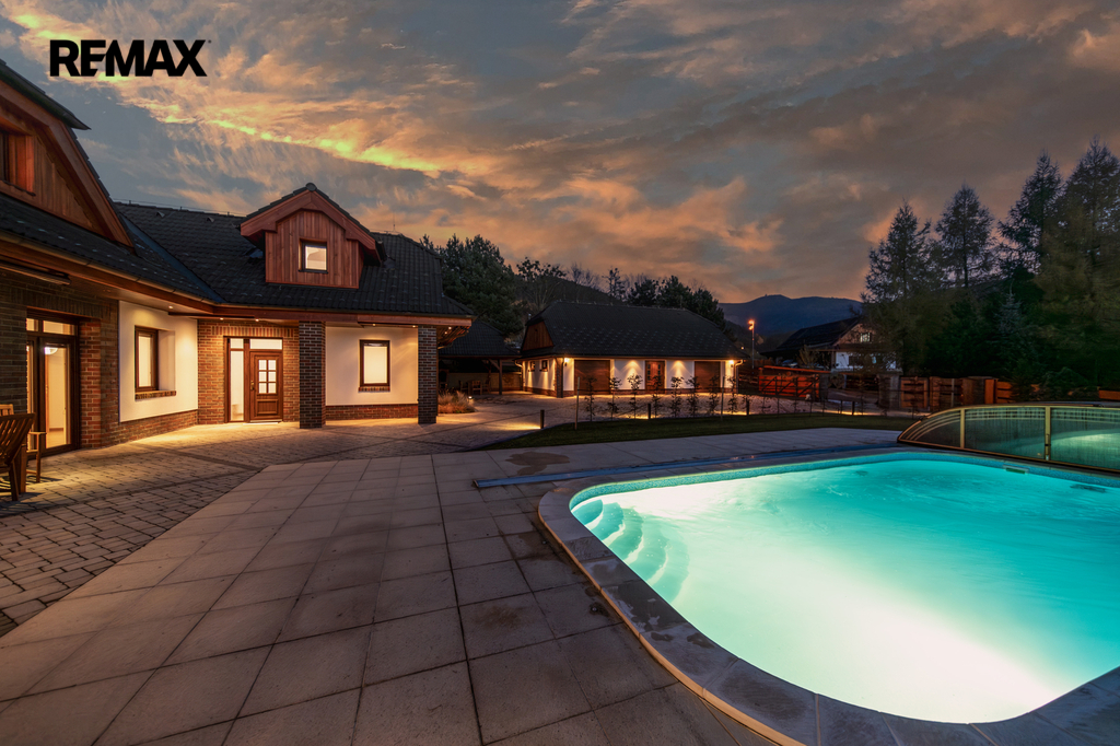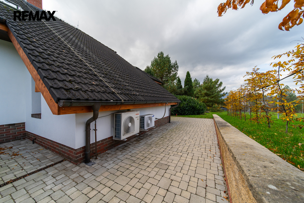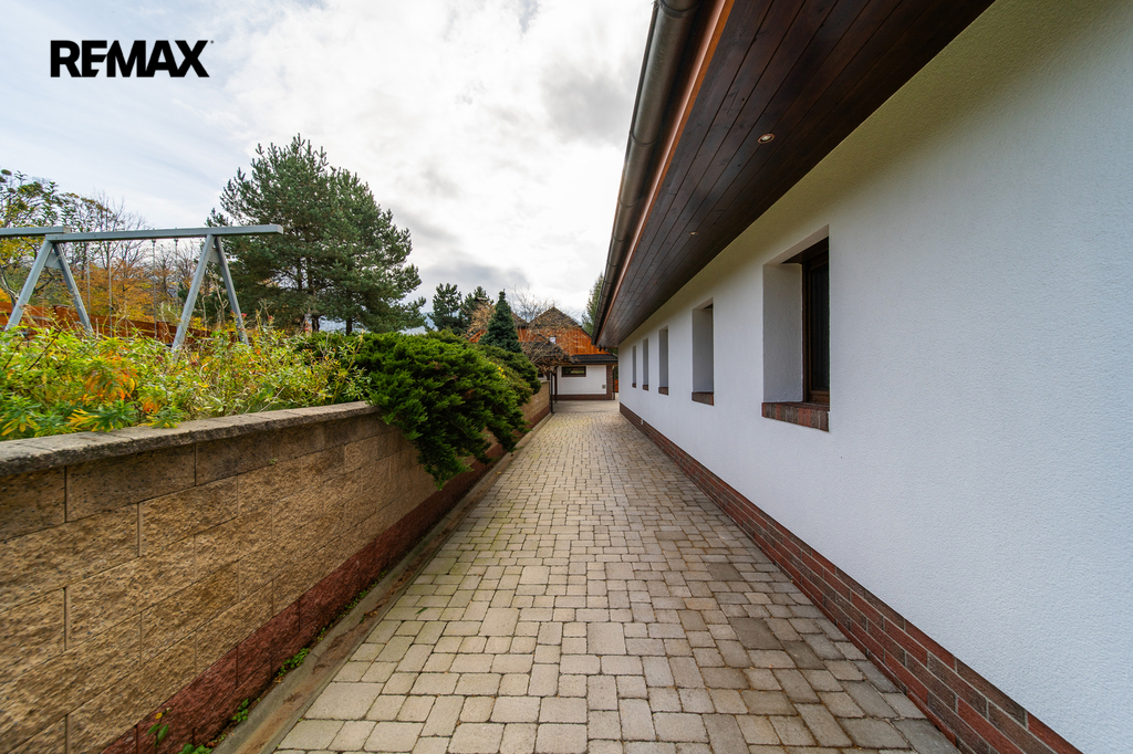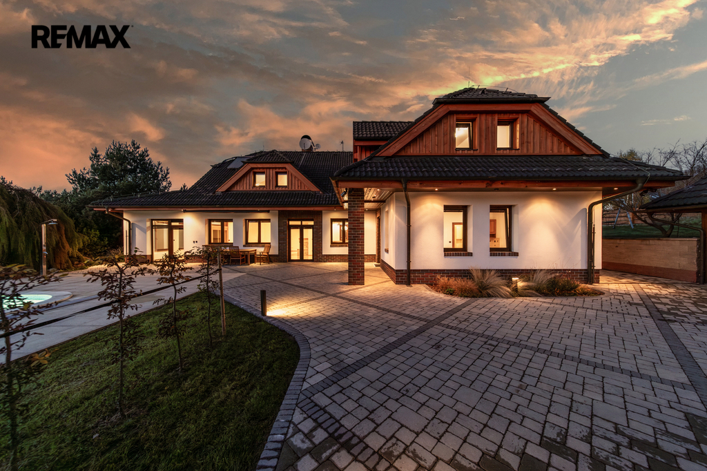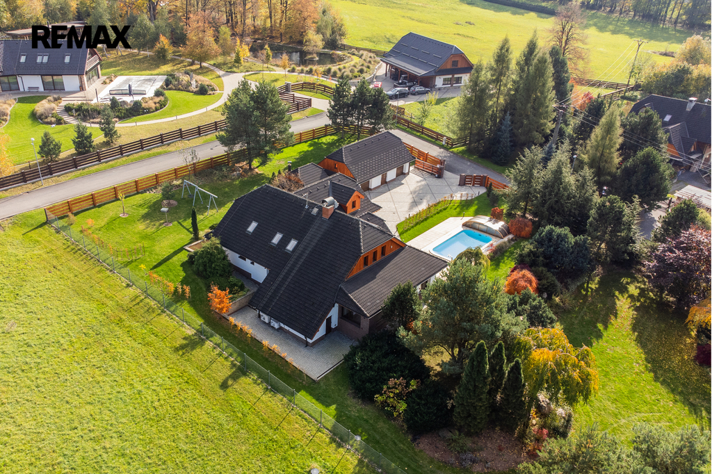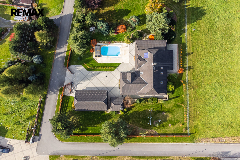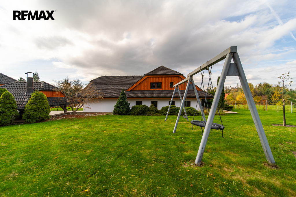 Rozsáhlé zpevněné plochy, terasa a připravený prostor pro bazén podtrhují charakter skutečného rodinného sídla. Pozemek poskytuje soukromí, otevřené výhledy do okolní krajiny a přímý kontakt s přírodou.