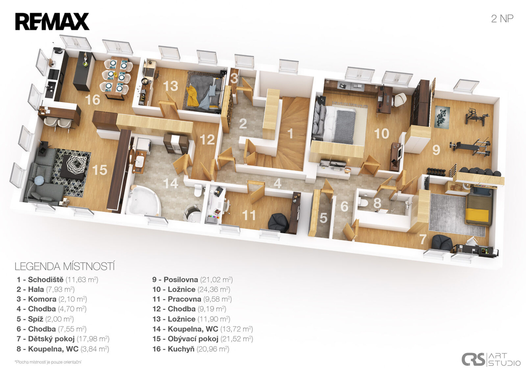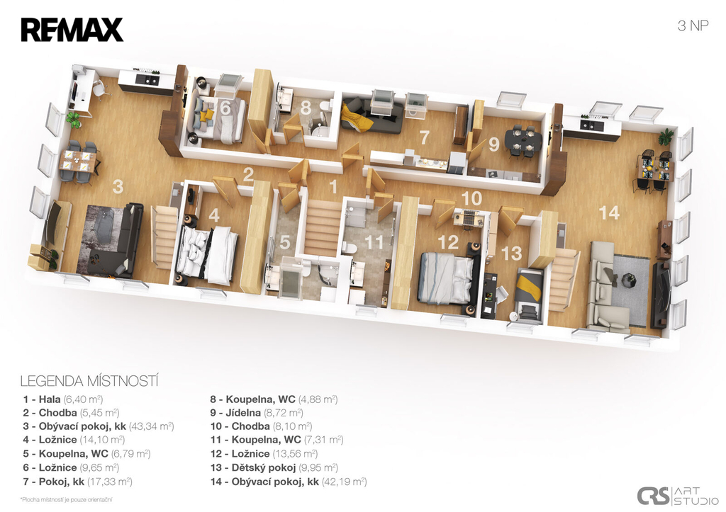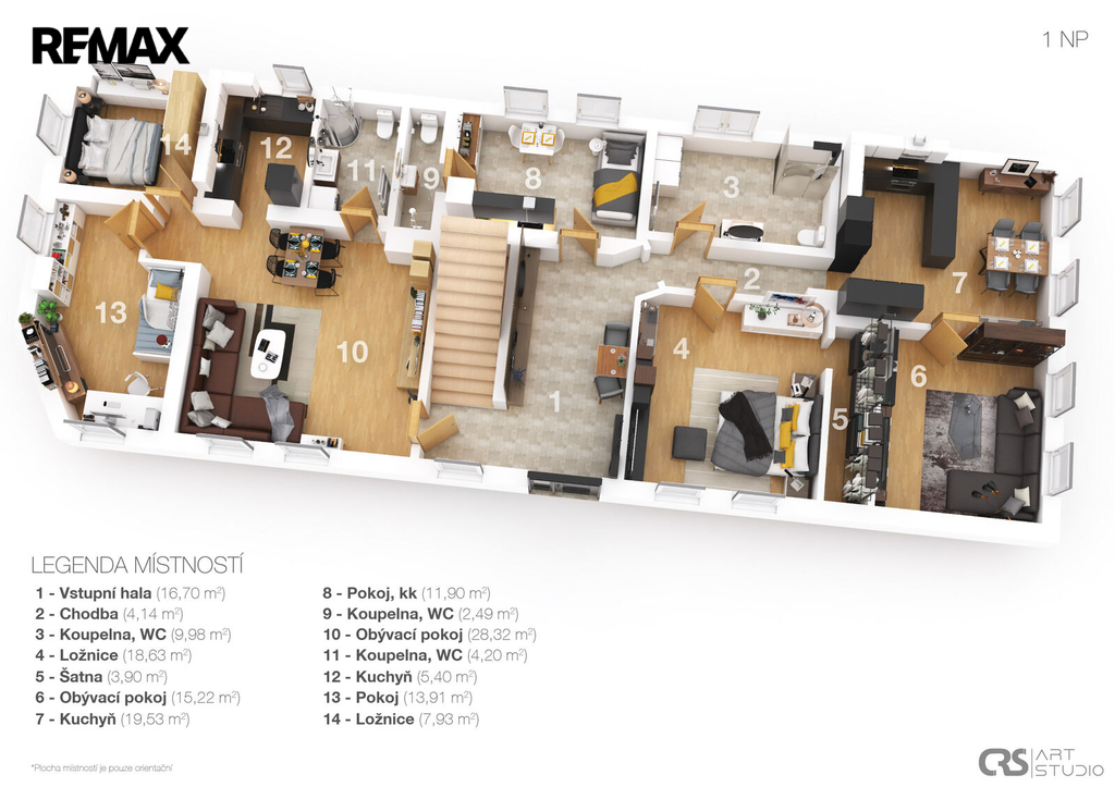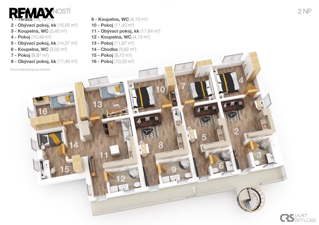 apartmán č. 1 5+1, 93 m², apartmán č. 2 2+kk, 35 m², apartmán č. 3 2+kk, 36 m², apartmán č. 4 2+kk, 36 m², apartmán č. 5 3+1, 58 m². V podkroví je navíc připravena možnost vybudování ještě dalších dvou bytových jednotek 3+1 o celkové ploše 135 m².