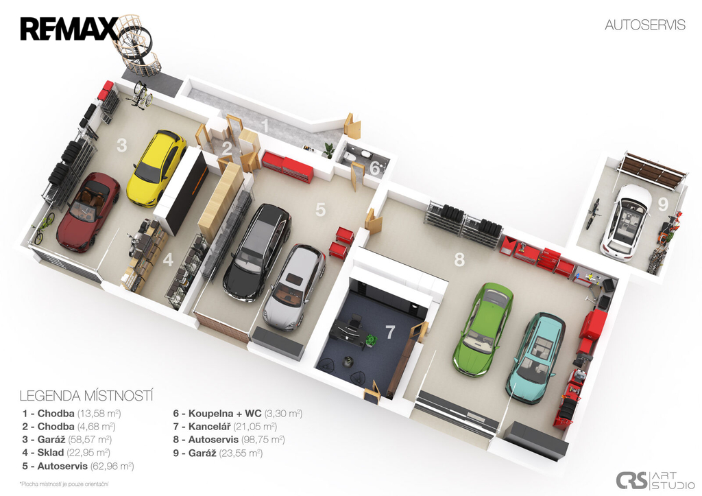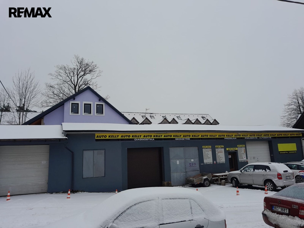 Samostatná zděná budova autoservisu a pneuservisu o užitné ploše 266 m² nabízí dílny, sklady, garážové i provozní zázemí. Před budovami jsou k dispozici parkovací plochy, celkem cca 15 parkovacích míst.