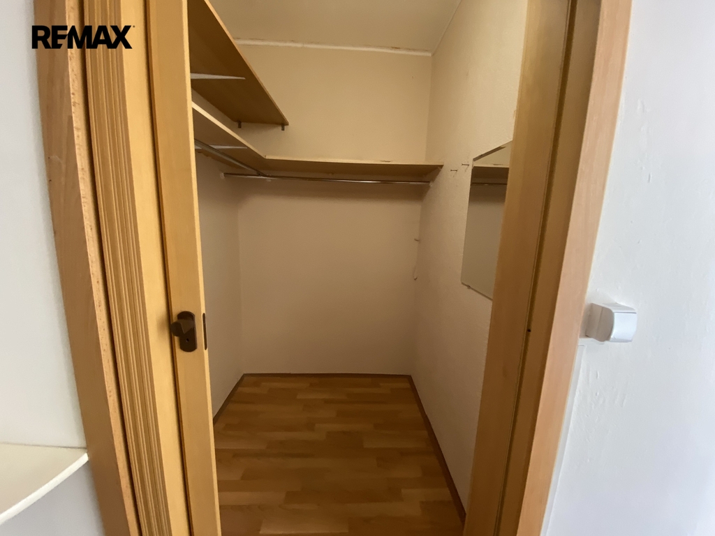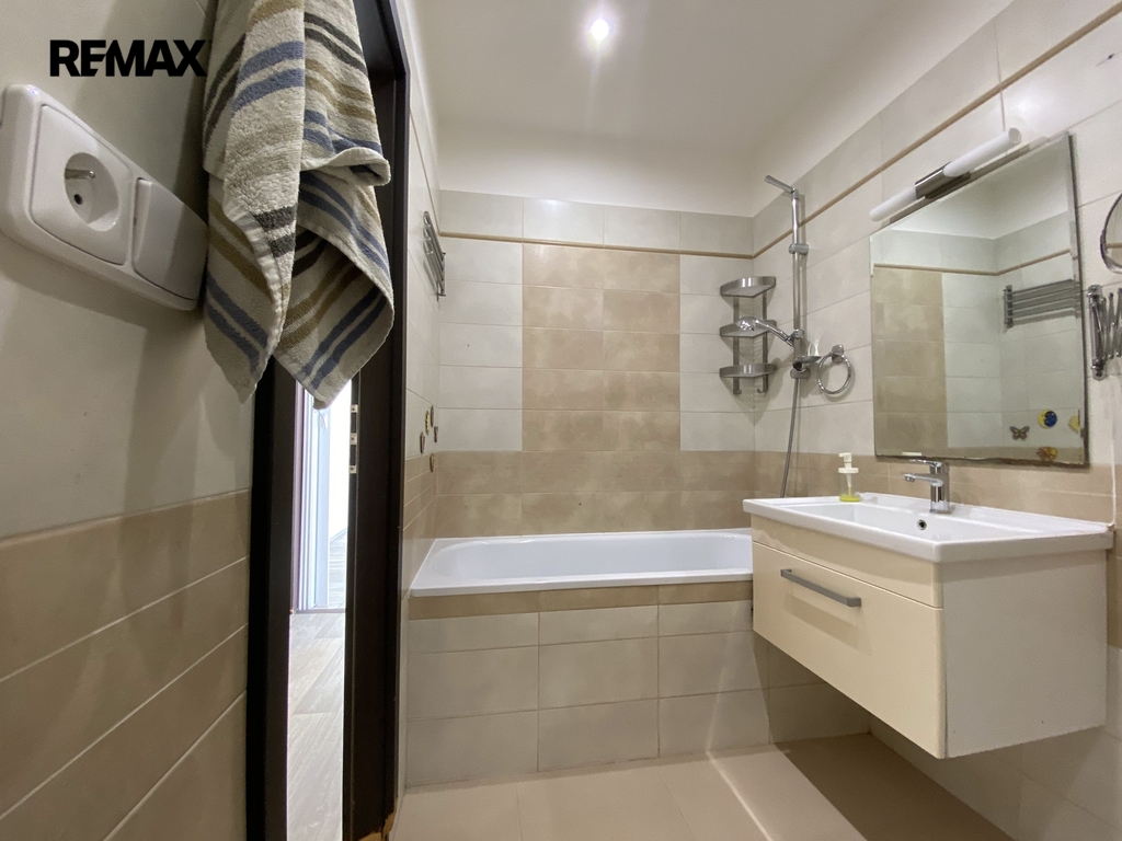 V bytě je dostatek prostoru pro umístění pračky i sušičky. Kromě dvou prostorných, samostatných pokojů je k dispozici také menší šatna, která poskytuje další úložný prostor.