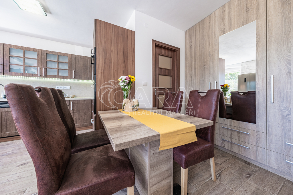 Do domu se vchází bývalým průjezdem, ze kterého je nyní uděláno prostorné garážové stání, takže pěkně suchou nožkou z domu do auta. Vjezd je opatřen novými elektrickými garážovými vraty se samostatným vstupem "pro pěší". Je zde umístěný Wallbox - nabíjecí stanice pro dvě elektroauta. Z průjezdu se vchází do přízemí domu nebo rovnou na zahradu. V přízemí je situován samostatný byt 1+kk, který je možno využít jako kancelář či máte-li odrostlejšího potomka a chce se cítit tak trochu samostatně, i zde je tato možnost, nebo pronájem. Byt je vybaven plně funkční kuchyňskou linkou, velkou a pohodlnou manželskou postelí s nočními stolky, komodou a TV, jídelním stolem a velkorysou šatní skříní na míru, prostornou koupelnou se sprchovým koutem a toaletou.