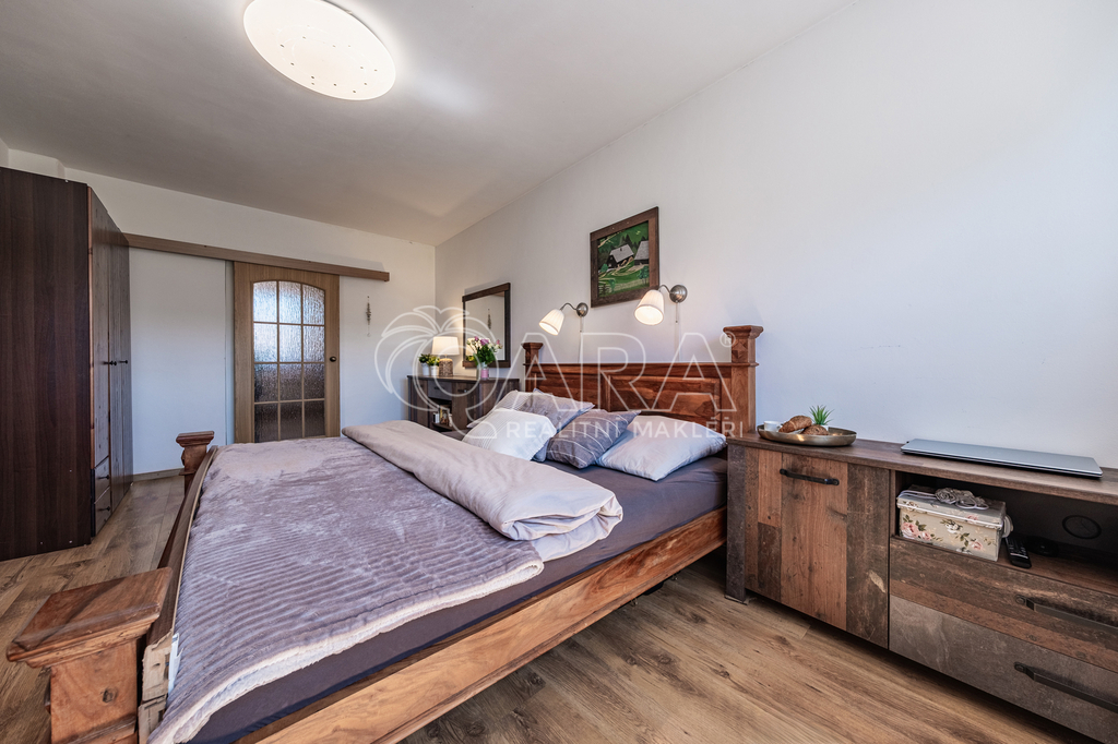Dominantou horního podlaží je prostorný a světlý obývací pokoj decentně sladěný a propojený s kuchyní, také plně funkční, jídelním koutem a pracovním prostorem. Na obývací pokoj navazuje útulná vybavená ložnice, a další ložnice, která je nyní využívána jako šatna, tělocvična a pracovna paní domu.