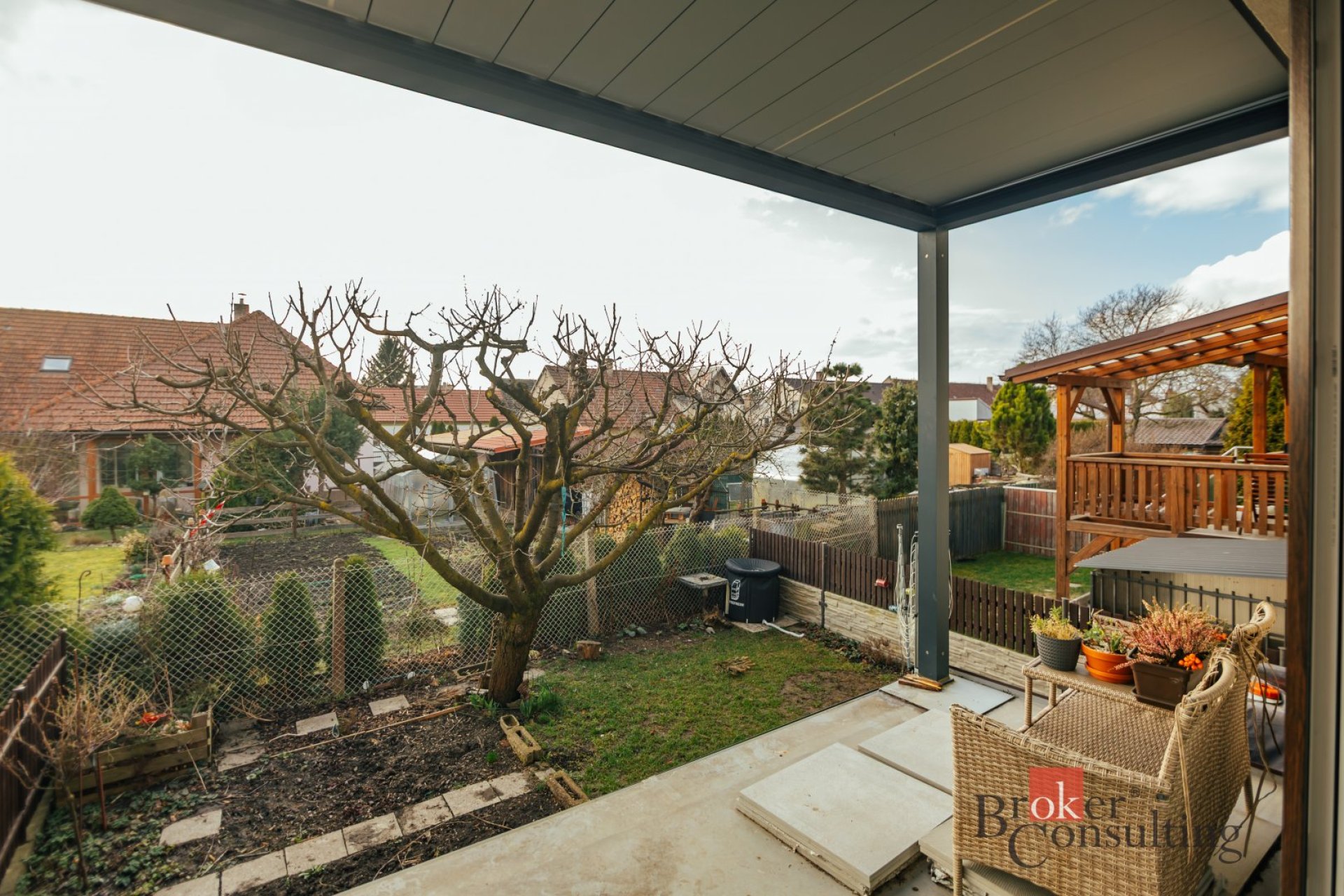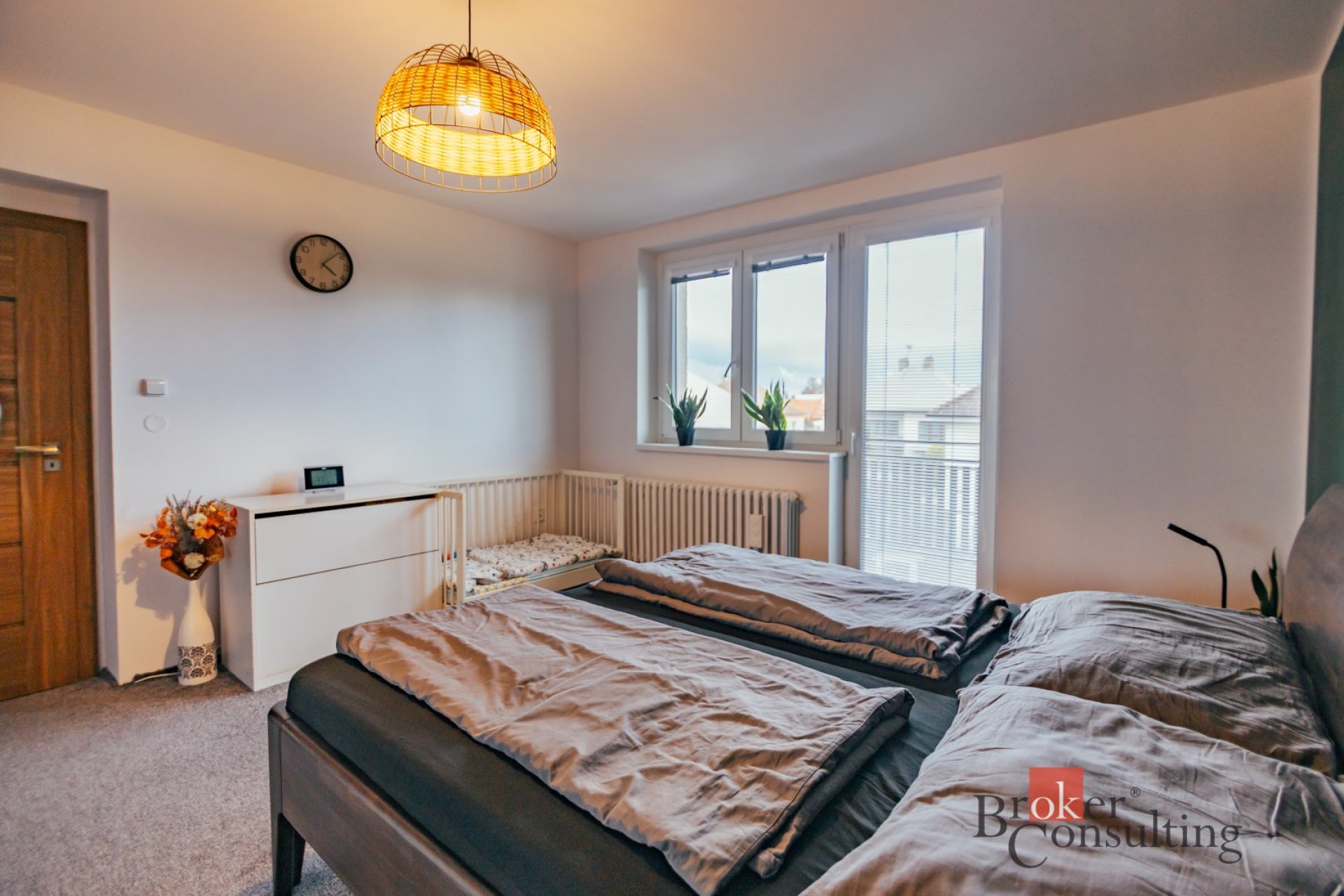 Dispozice domu: Zvýšené přízemí nabízí vstupní chodbu, prostorný obývací pokoj s jídelnou se vstupem na zahradu, moderní kuchyni a samostatnou toaletu. V patře se nachází ložnice, dětský pokoj, další obytná místnost vhodná např. jako pracovna, koupelna s vanou i sprchovým koutem. Z obou stran domu jsou balkony.