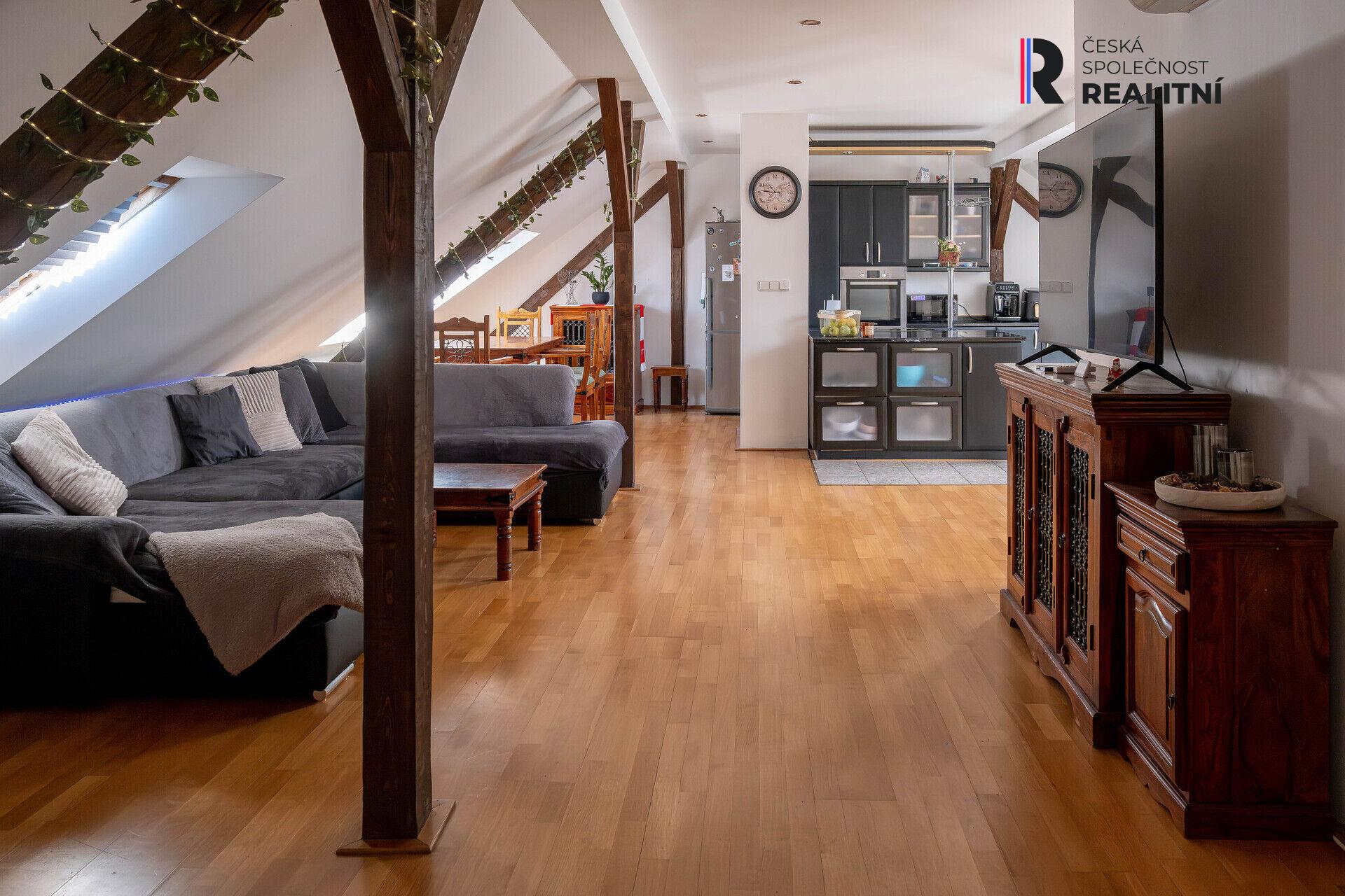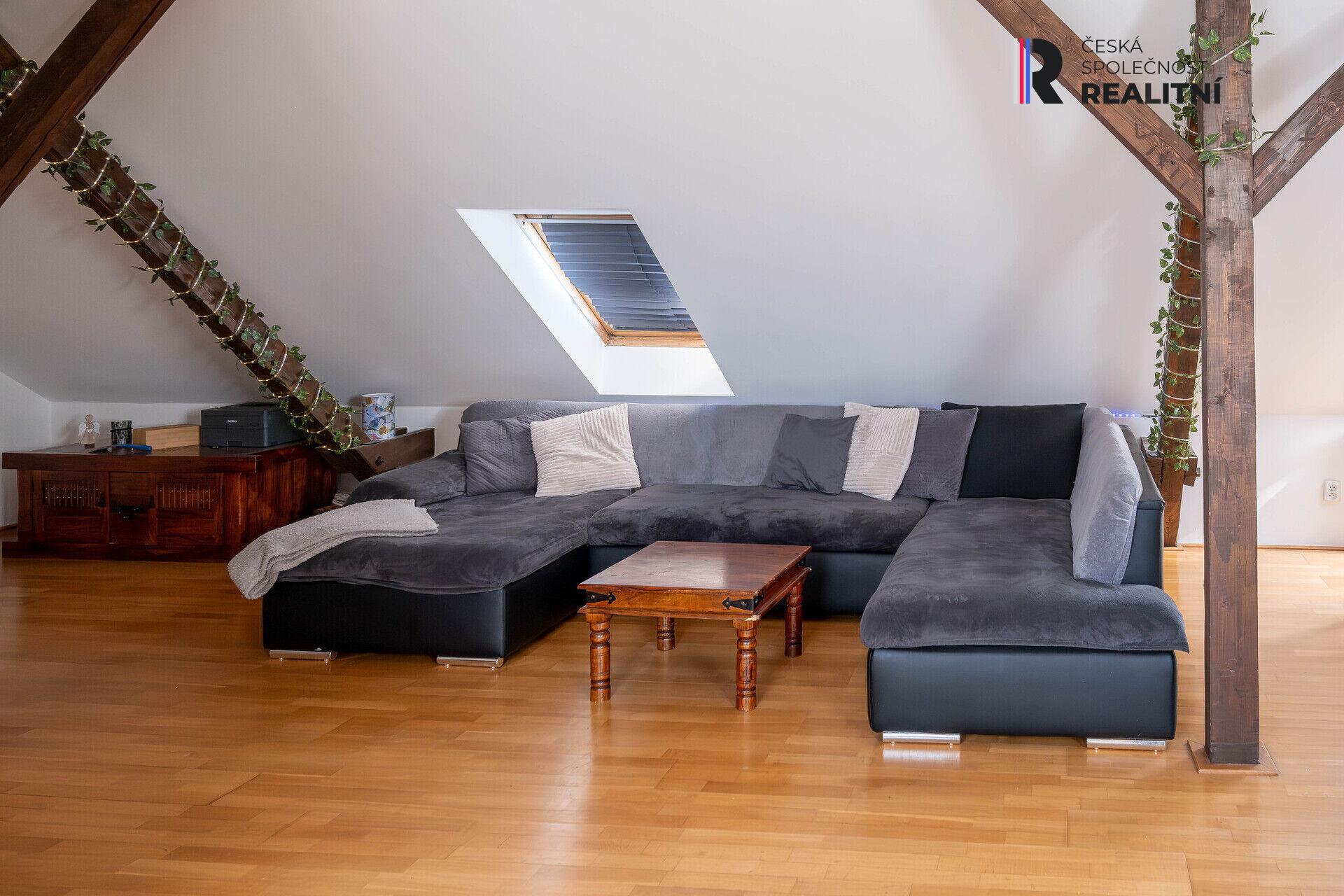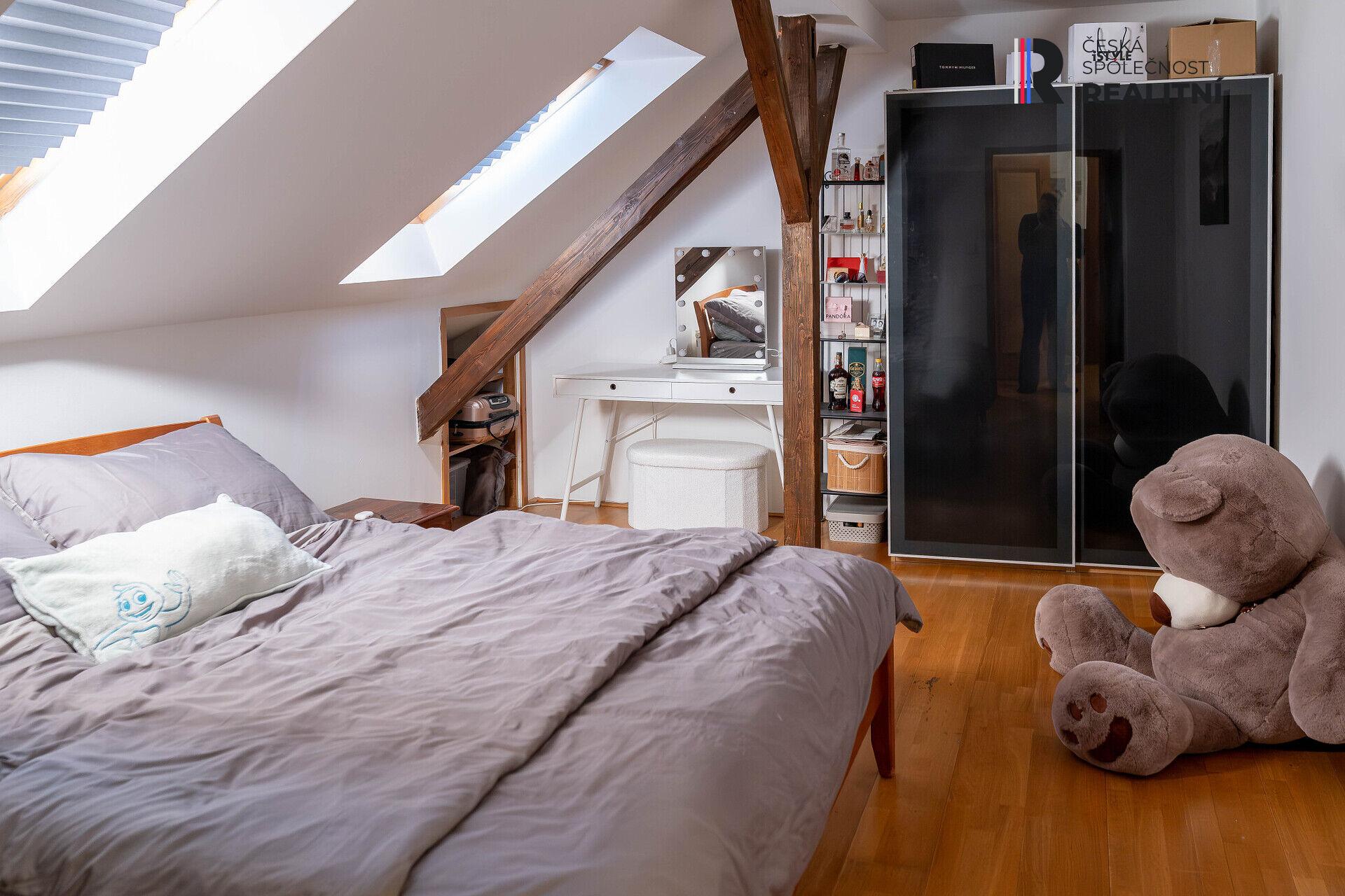 Byt vznikl vestavbou do půdního prostoru a zabírá celou délku domu, přibližně 24 metrů. Díky tomu nabízí netypické řešení prostoru a větší variabilitu využití jednotlivých místností. Dispozice je řešena jako 4+kk, přičemž jednotlivé části bytu na sebe navazují v podélném uspořádání. Prostor působí otevřeně a umožňuje případné úpravy dle potřeb nového vlastníka.