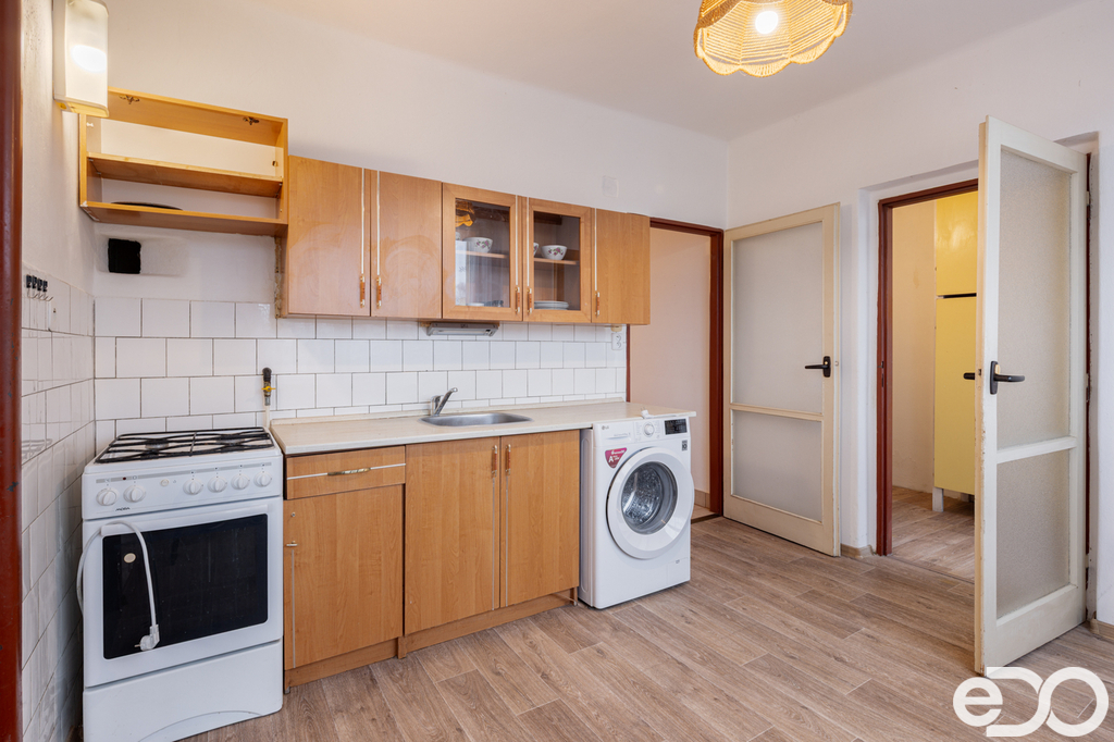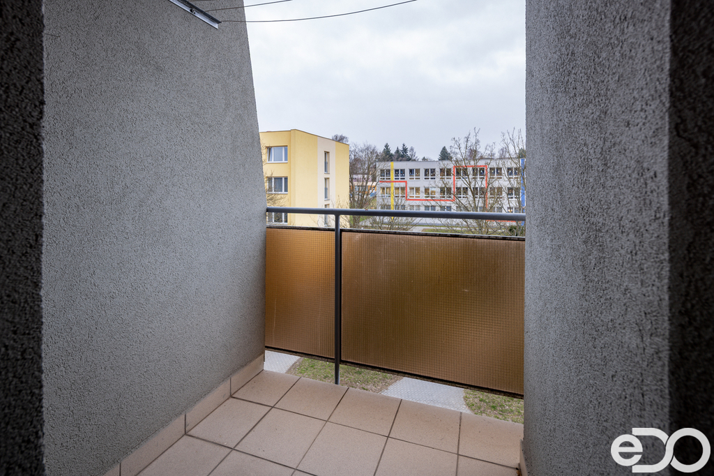 Středem bytu je velký obývací pokoj a oddělená kuchyně, která je separátně průchozí i z chodby a zároveň vede do prostorné komory s balkonem.