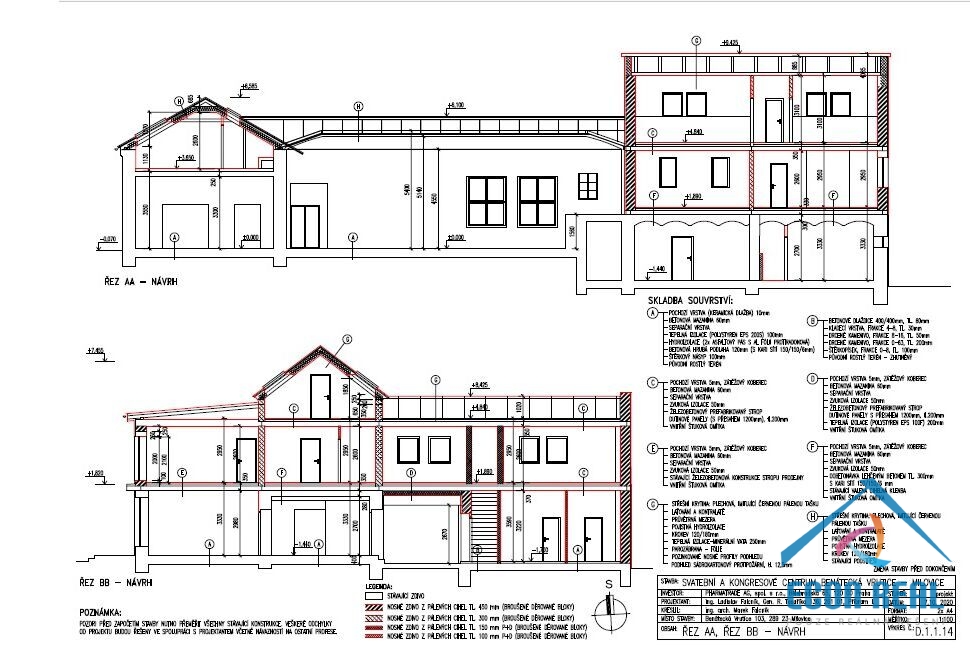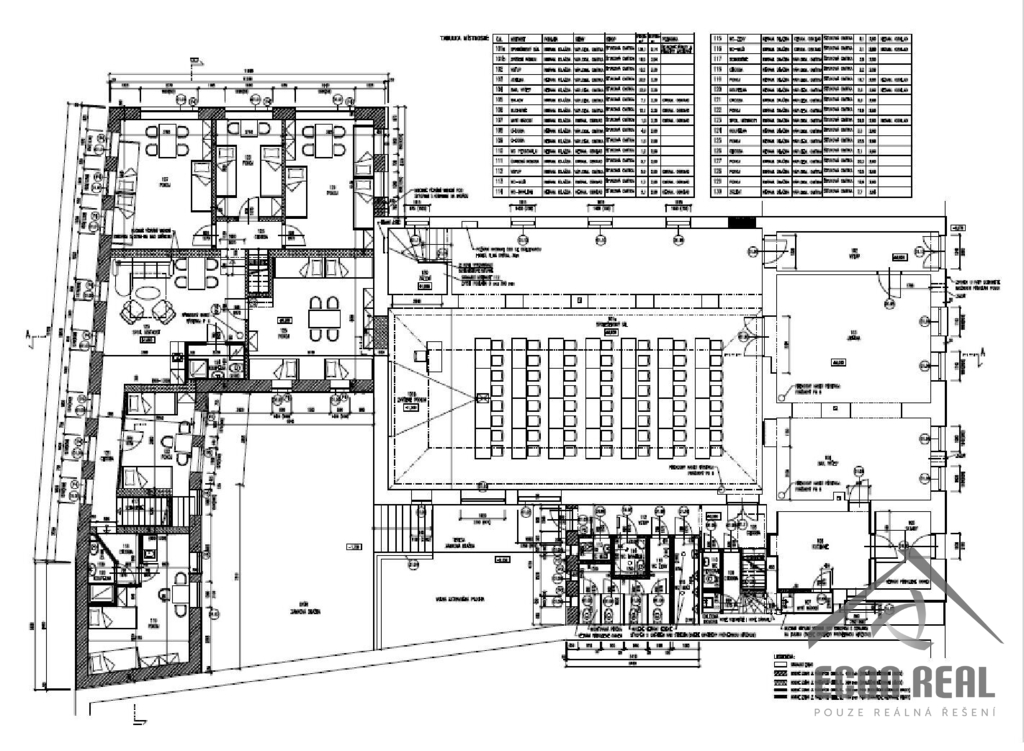 1.NP - gotický sál, gastro provoz s přípravnou, sociální zázemí, obchod se zázemím a vstupem pro zaměstnance, vstup do sklepa, byt správce, vnitroblok