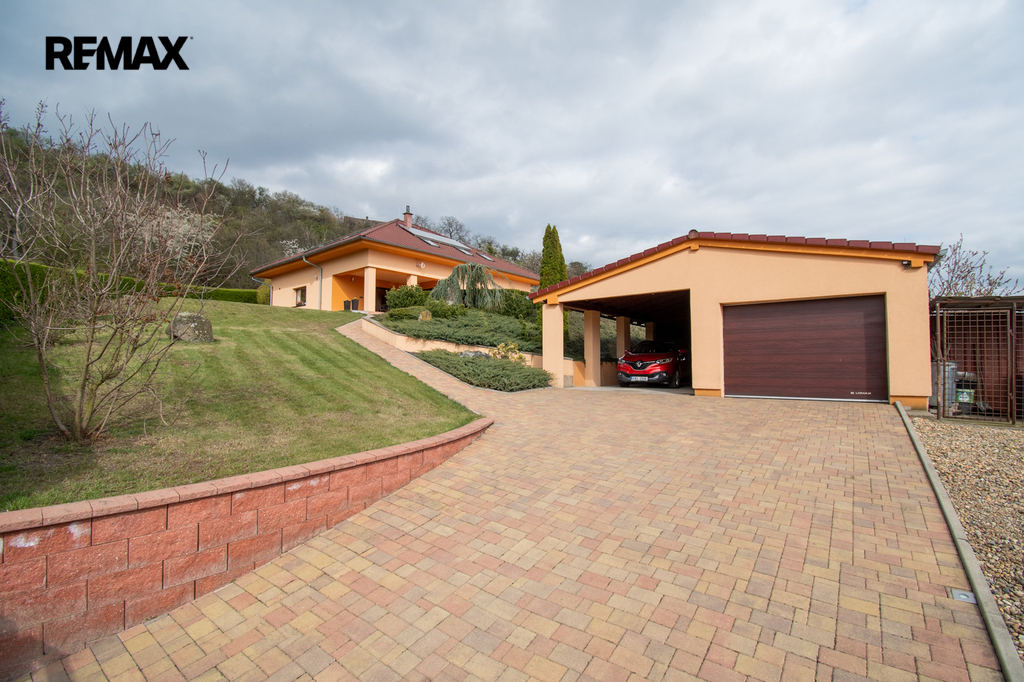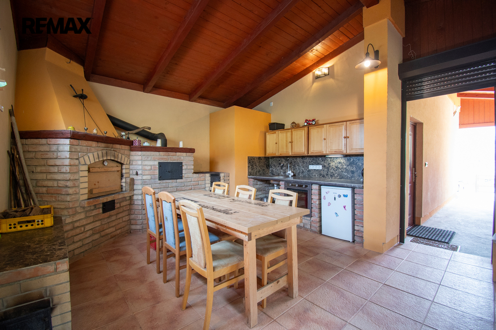 Vedlejší stavba garáže s krytým stáním je umístěna na spodní části pozemku. Prostranství před garáží se zámkovou dlažbou a místem pro tři osobní vozy. Vjezd ze silnice je osazen automatickou dálkově ovladatelnou branou. Součástí stavby garáže je venkovní letní kuchyň. Je zde udírna, pec a klasická kamna s litinovým tálem a troubou dále kuchyňská linka. Ideální místo pro oslavy i posezení s přáteli. Tento prostor lze jednoduše zvětšit o venkovní zastřešenou část a získáte tak mnohem více místa pro vaši akci.