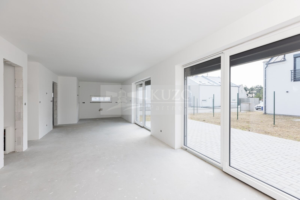 V přízemí přes vstupní předsíň se nachází prostorný obývací pokoj s kuchyňským koutem o výměře skvělých 43 m2, dále koupelna se sprchovým koutem a toaletou, technická místnost a prostorná garáž o výměře téměř 29 m².