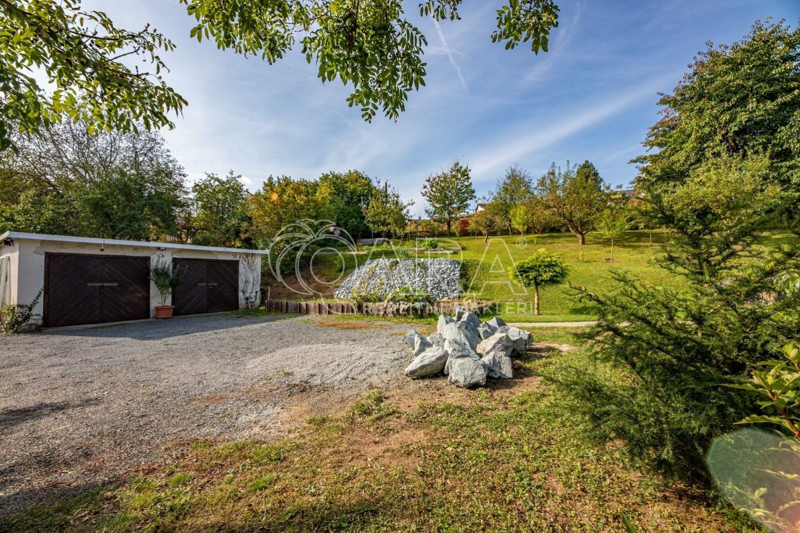 Pozemek je z části rovinatý a v části se vzrostlými stromy, skleníkem a zeleninovými záhony svažitý.