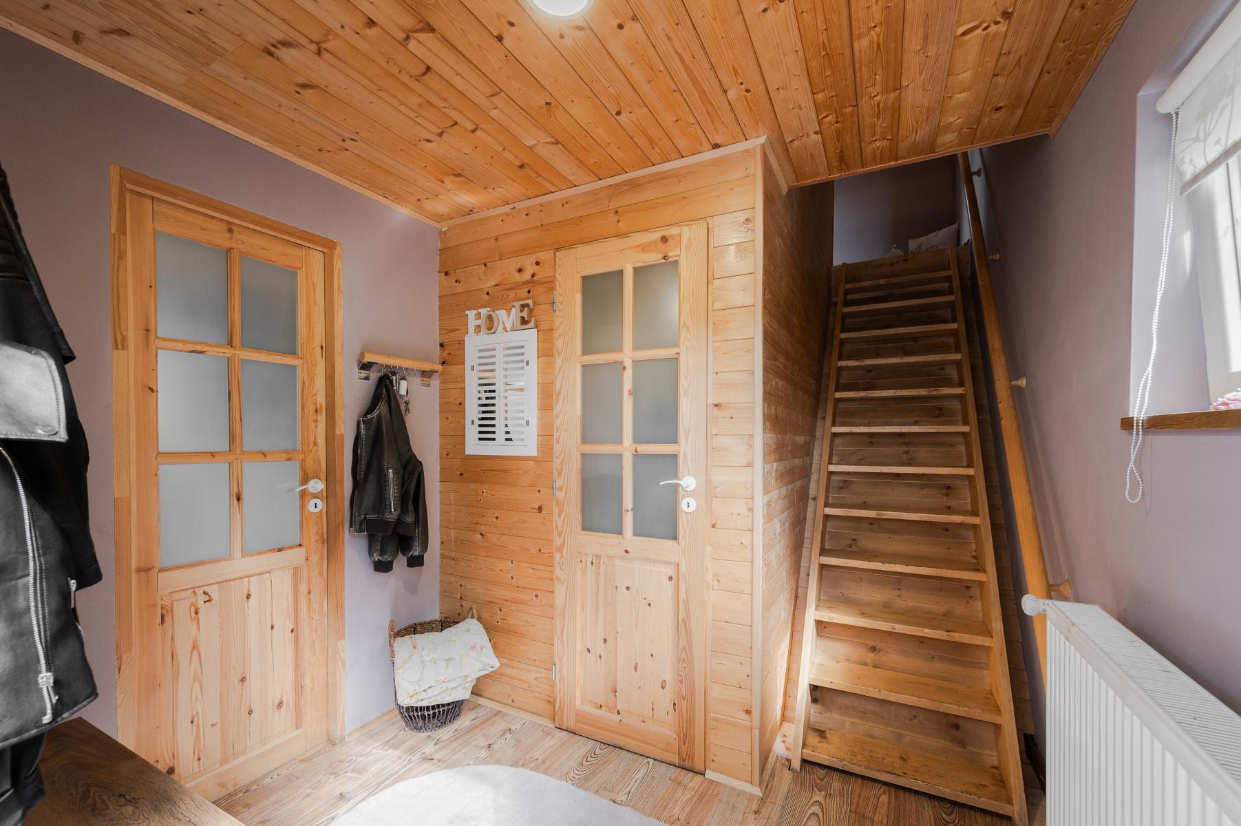 V přízemí se nachází vstupní předsíň, ložnice, garáž/technická místnost a přímý vstup na zahradu. Hlavní obytné podlaží nabízí prostorný obývací pokoj s vybaveným kuchyňským koutem, koupelnu se sprchovým koutem a francouzské okno vedoucí na terasu a zahradu. Podkroví lze využít jako další pokoj či dětský prostor.