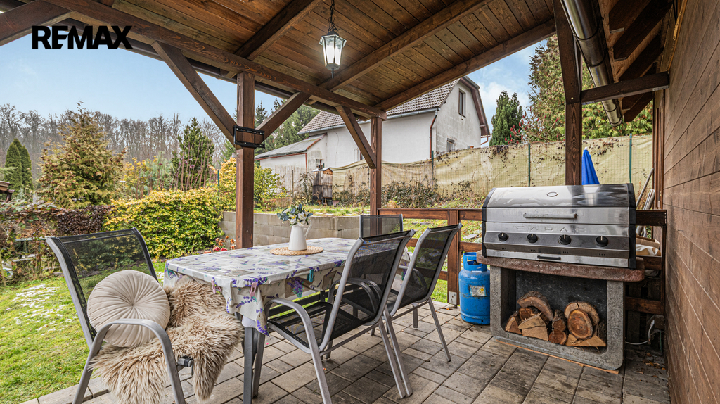 K chatě náleží pergola, ideální pro posezení s rodinou či přáteli na čerstvém vzduchu. Plocha pozemku činí 241 m² a nabízí dostatek prostoru pro relaxaci či možné úpravy dle vlastních představ, je zde i připravená zpevněná plocha pro bazén, vířivku nebo saunu. Dále je zde dostupnost internetu a telefonní linky, což zajišťuje možnost pracovat i na dálku v příjemném prostředí přírody.