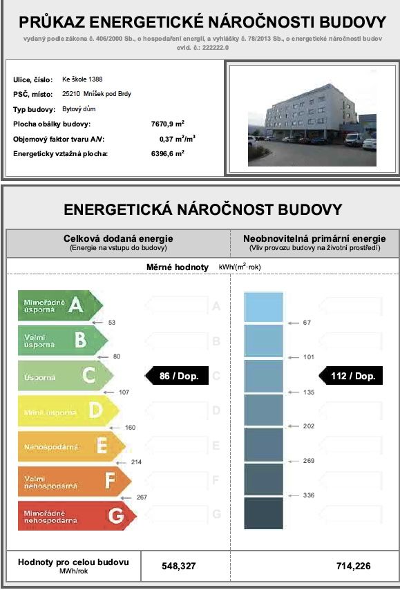 - Ukazatel energetické náročnosti budovy: 86 kWh/m²