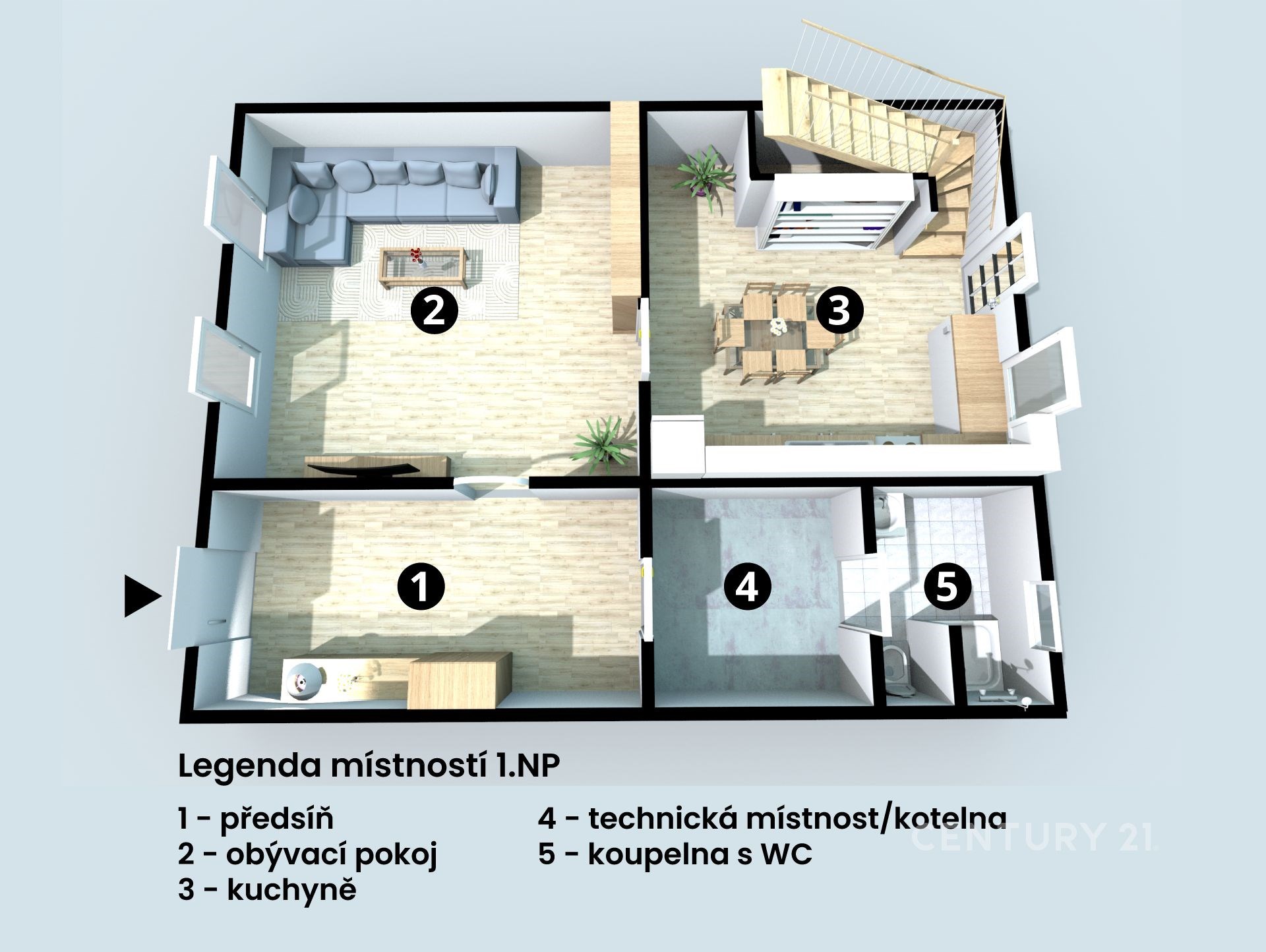 V přízemí o dispozici 1+1 o podlahové ploše cca 78 m² se nachází prostorný obývací pokoj a kuchyň, které nabízejí dostatek prostoru pro pohodlné bydlení. Dále je zde nově zrekonstruovaná koupelna se společným WC a technická místnost.