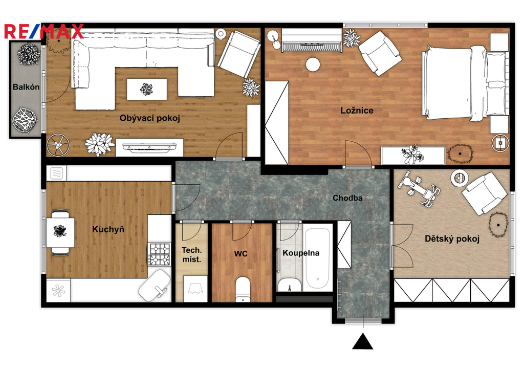 Byt svou velikostí splňuje požadavky rodinného bydlení, pokoje nejsou průchozí, je kladen důraz na soukromí členů domácnosti. Byt sestává z dětského pokoje, ložnice, obývacího pokoje, ze kterého můžete vstoupit na malý balkon a kuchyně. Koupelna a toaleta jsou samostatné, oceníte technickou místnost pro umístění pračky a sušičky.