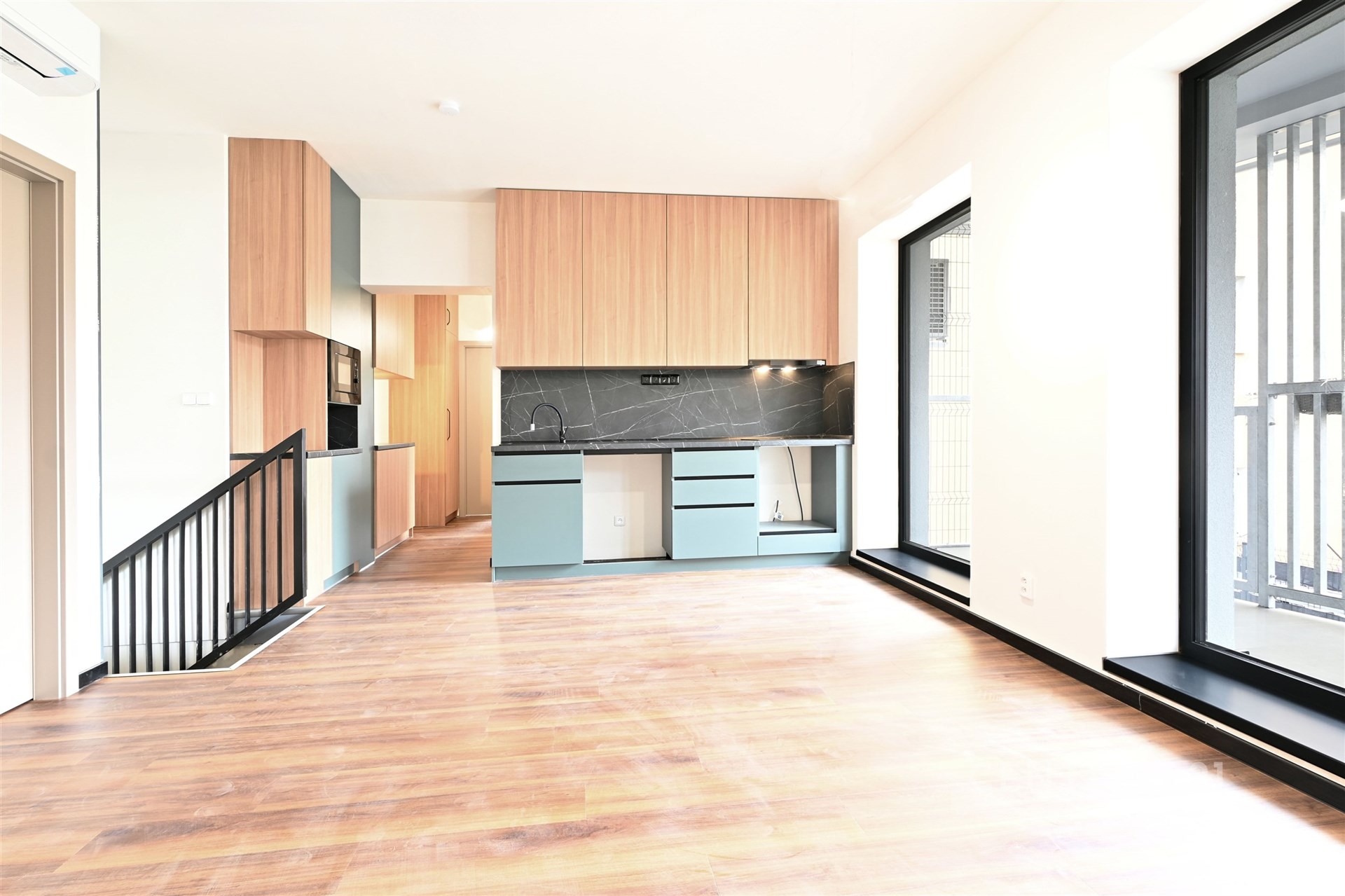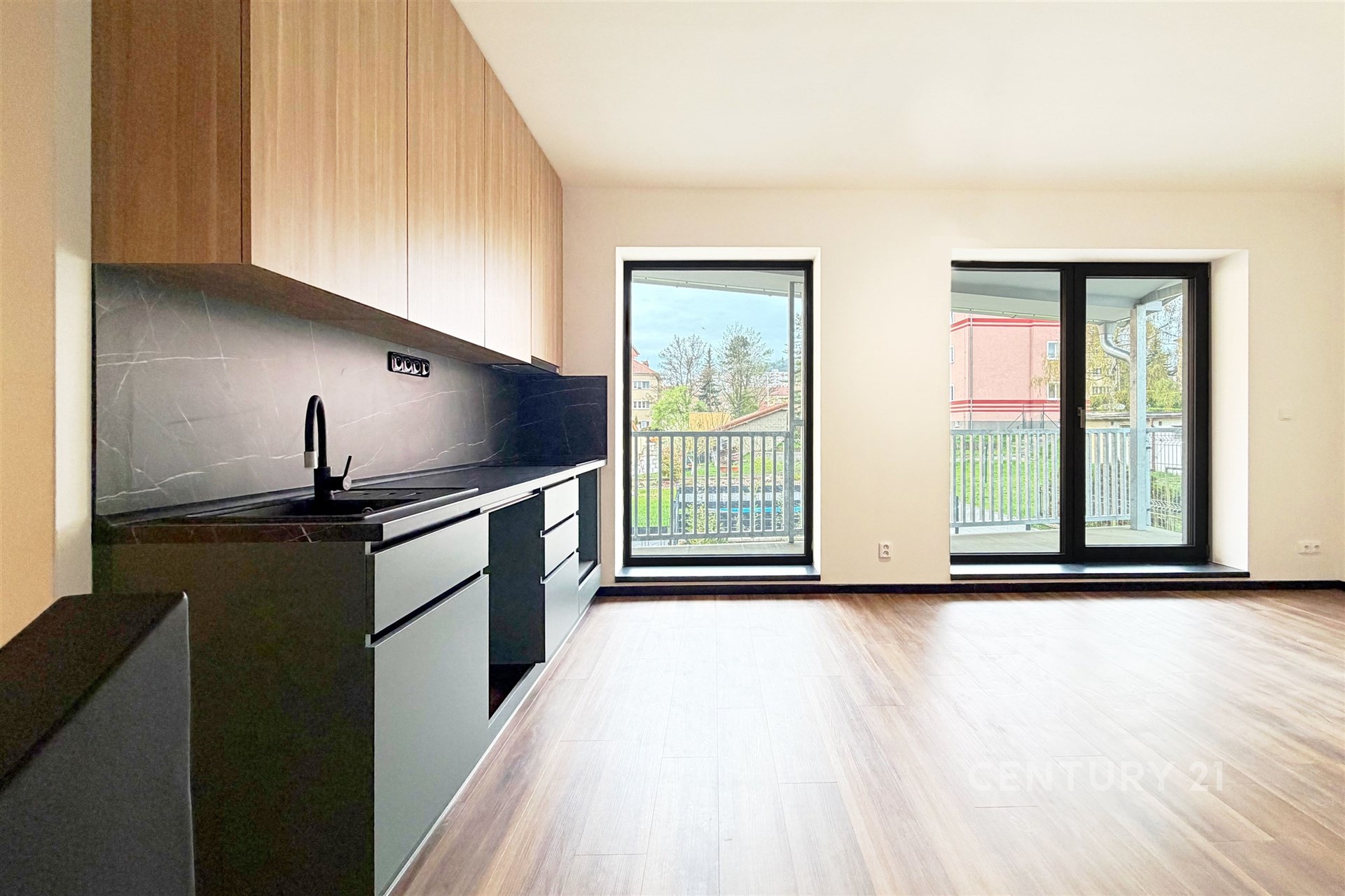 Designová kuchyně: Velkorysá moderní linka s dostatkem pracovní plochy a úložného místa, která se stane srdcem vašeho domova. Ta je propojena se světlým obývacím prostorem. Odtud je vchod na balkon.