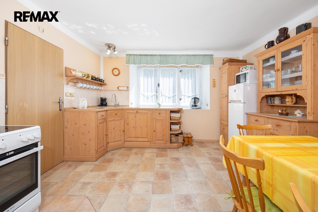 Kuchyni s jídelnou (15,5 m²) s kamny na dřevo a elektrickým sporákem.