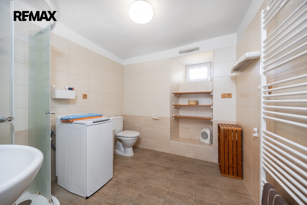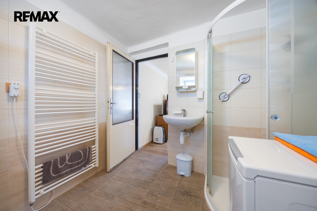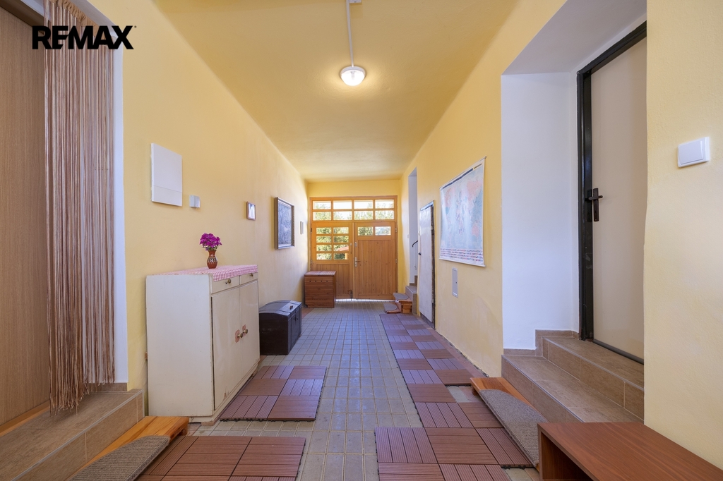 Koupelnu s WC, další samostatnou toaletu, sklep a praktický, široký průjezd z ulice na zahradu, s možností úpravy pro parkování.