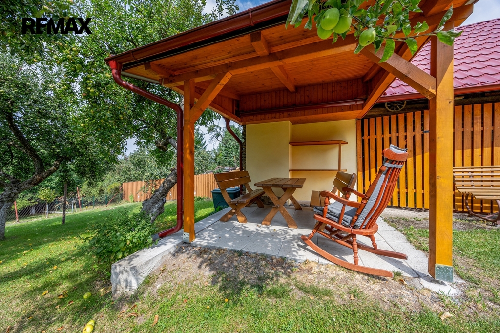Dvě vedlejší stavby: dílna a dřevník včetně terasy s krytým posezením.