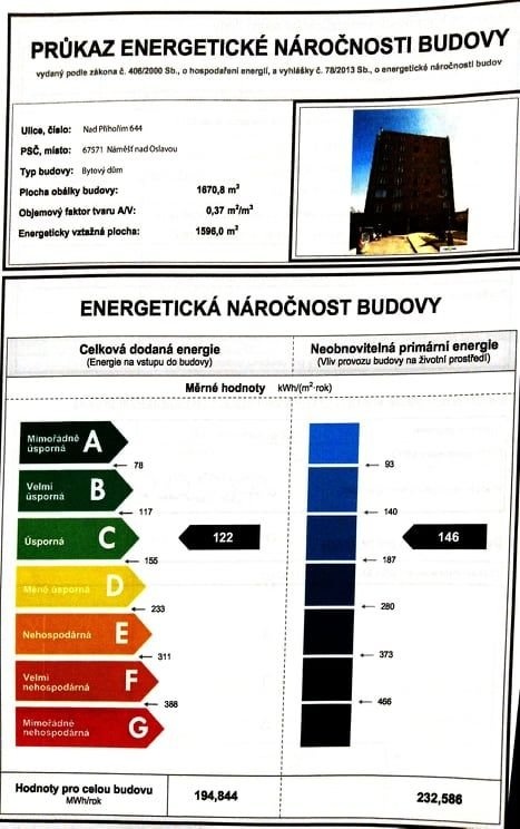 - Ukazatel energetické náročnosti budovy: 122 kWh/m²
