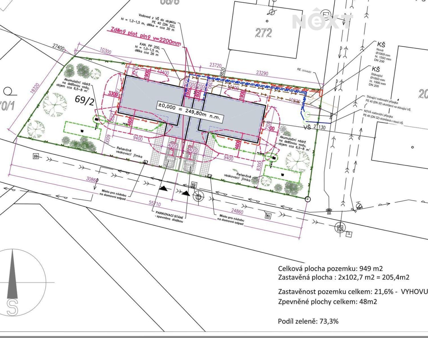 Pozemek je součástí celku o rozloze 949 m², na který je vydáno pravomocné stavební povolení na výstavbu rodinného dvojdomu (2× 110 m² zastavěné plochy).