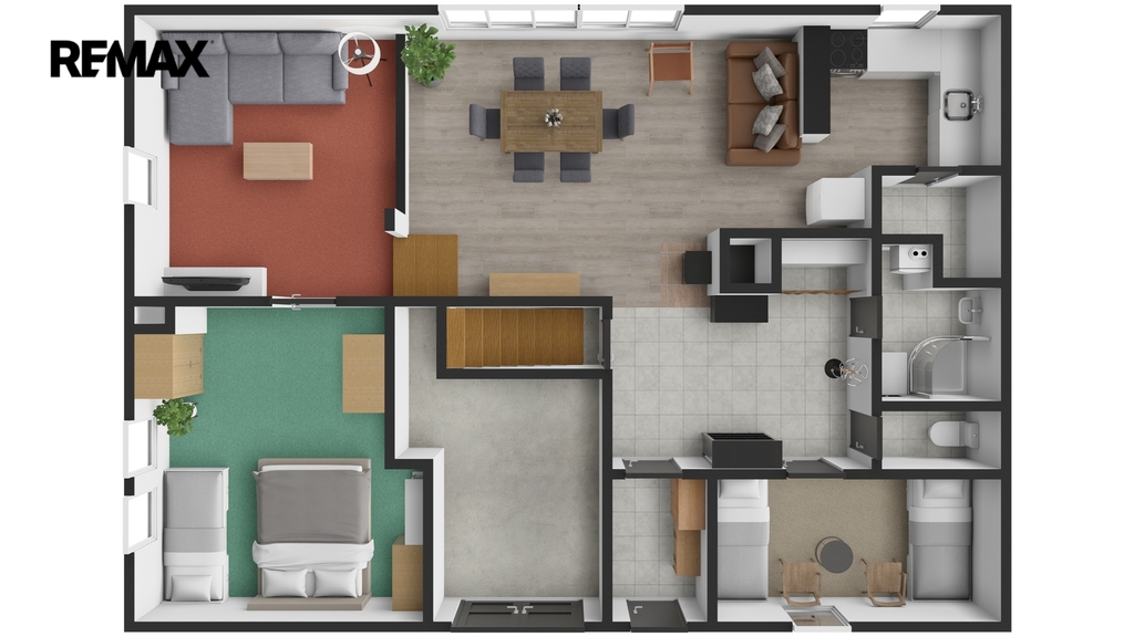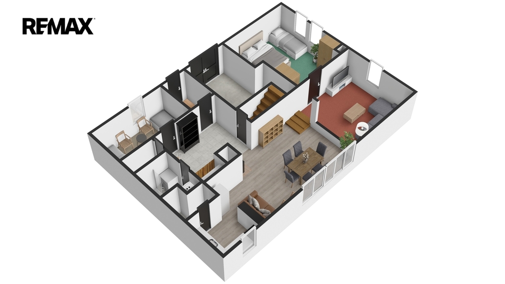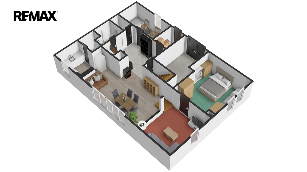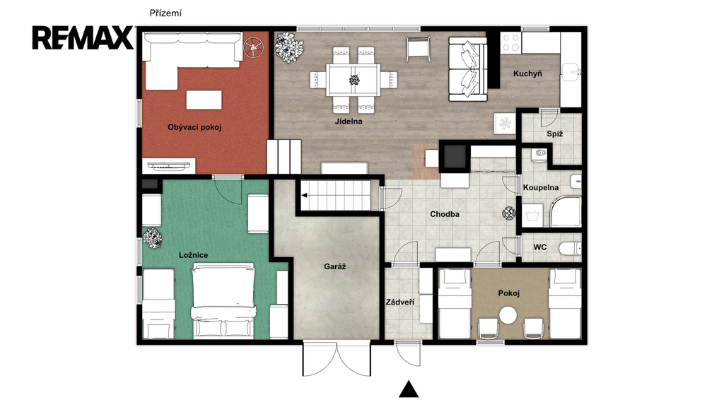 Propojením velké části přízemí vznikl dominantní společný prostor s kuchyní, obývákem a jídelnou. Všude je dostatek oken a tedy i světla po celý den. Na každé straně domu je jedna ložnice, takže nemusíte vůbec chodit do patra. Stejně tak je v přízemí i koupelna a toaleta.