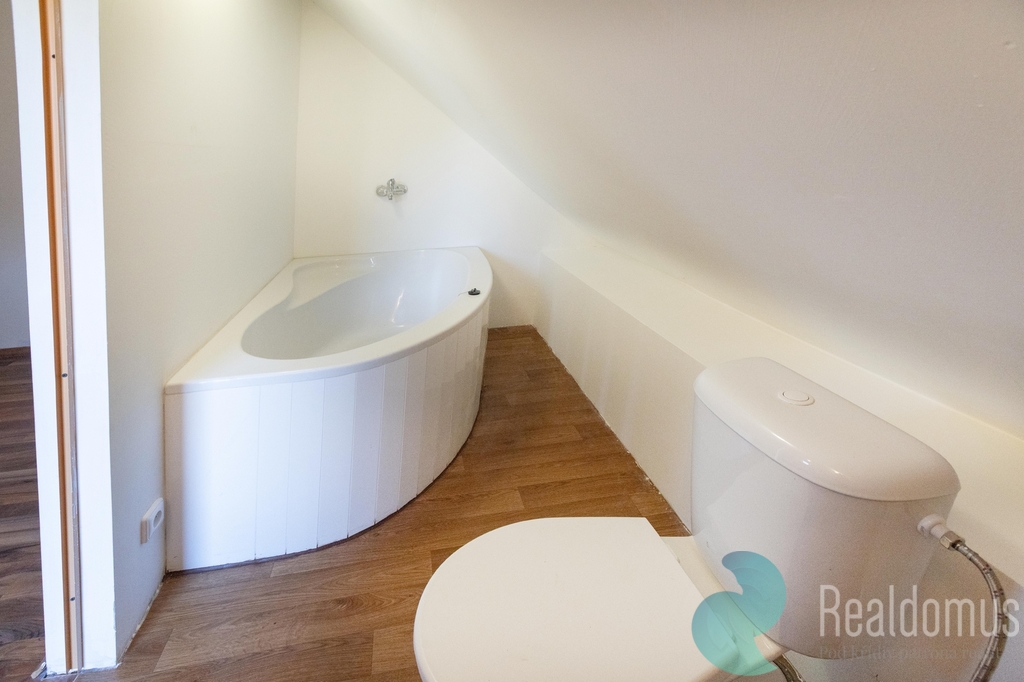 Po venkovních schodech vystoupáte do nově dokončeného obytného podkroví, kde najdete další kuchyňský kout, obývací pokoj, ložnici i koupelnu s vanou a WC – prostor perfektní pro rodinu nebo návštěvy.