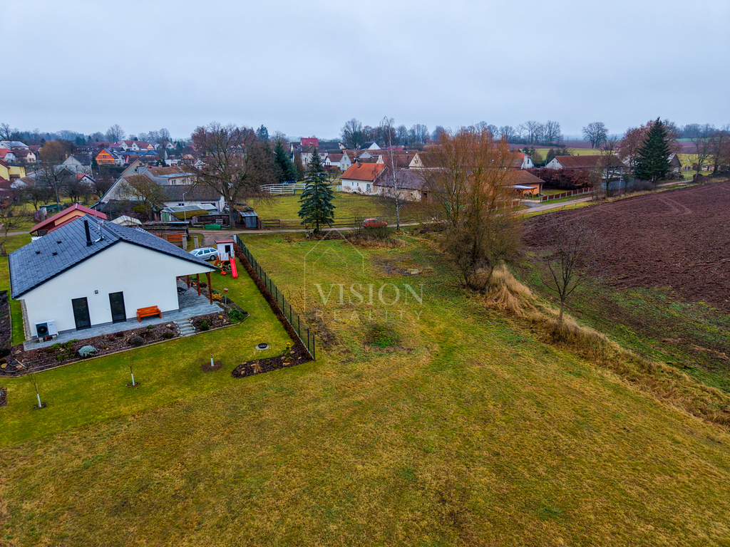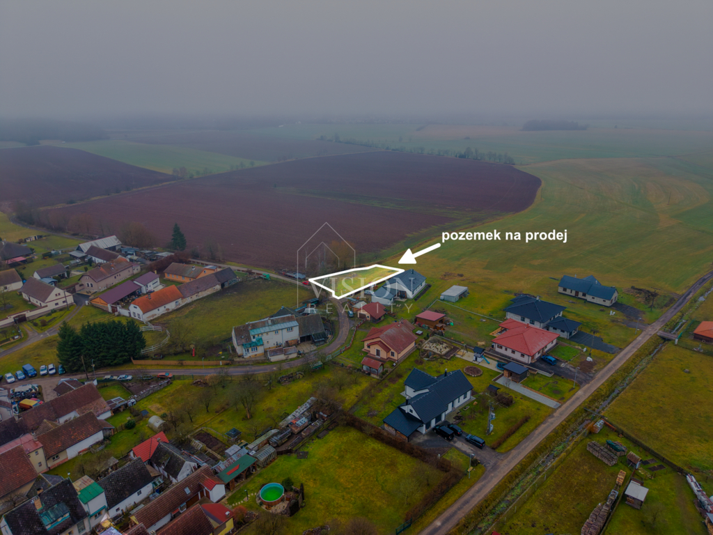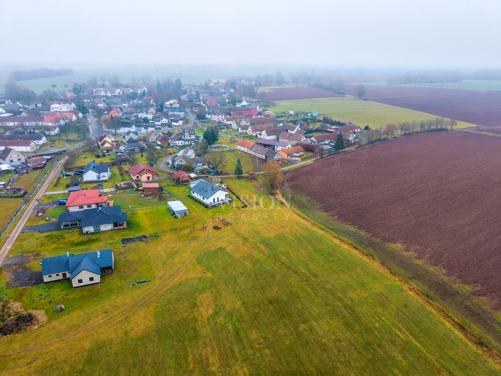Pozemek leží na kraji obce, kde již vznikají nové domy, což zajišťuje klid a komfortní bydlení. Elektřina a kanalizace jsou přímo na hranici pozemku a vodu lze přivést z obou stran, takže umístění domu můžete naplánovat přesně podle svých představ.