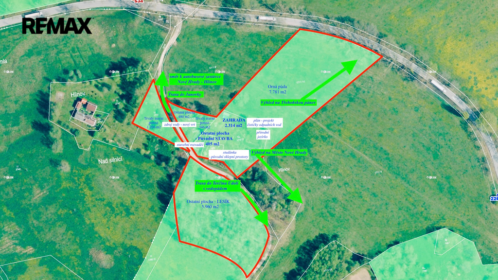 Dle územního plánu lze postavit dům do I. NP s obytným podkrovím (případně podsklepení), s výškou do 5 metrů a sedlovou střechou se sklonem 35–45° (roubenky a sruby nejsou povoleny). Lokalita vás okouzlí výhledy na scenérii Města Nové Hrady, na Třeboňskou pánev a směrem k Údolí u Nových Hradů, přičemž Nové Hrady (5 km) i České Budějovice (31 km) jsou jednoduše na dosah.
