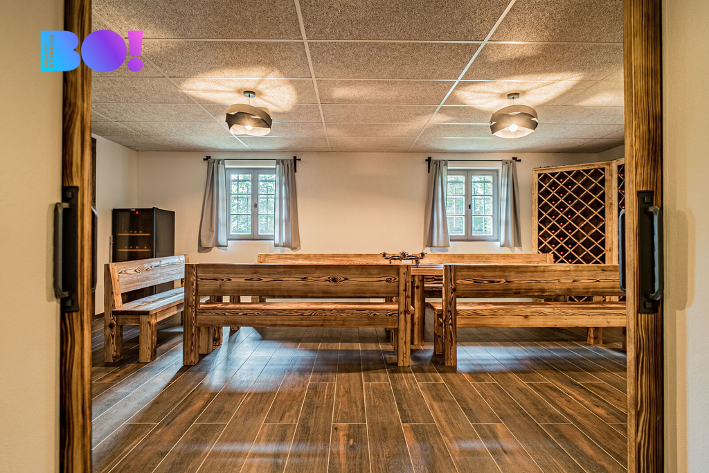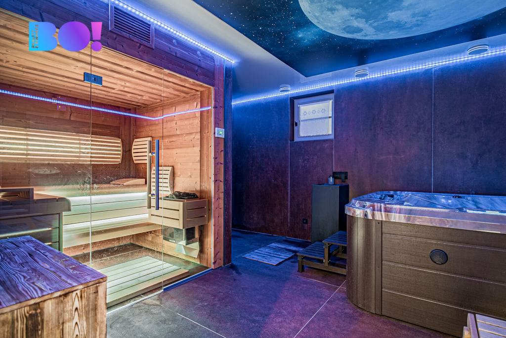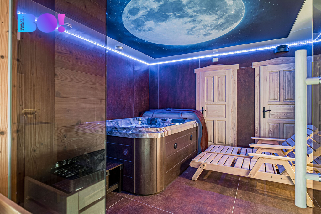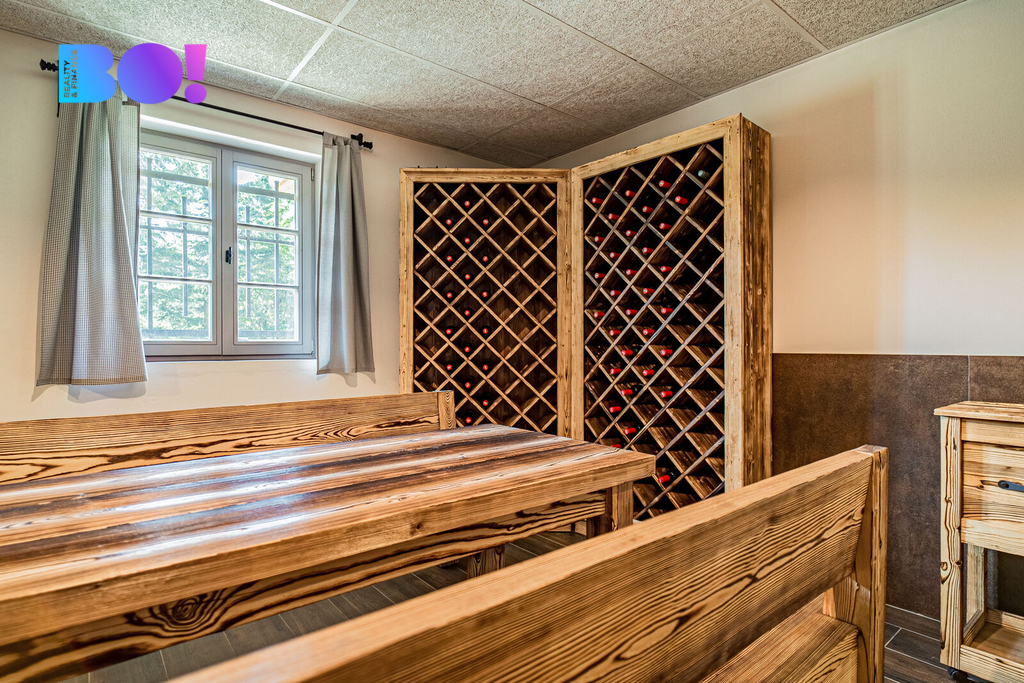 Skutečnou perlou této nemovitosti je přízemí, které bylo proměněno v privátní wellness zónu. Najdete zde vířivku BALBOA, saunu, sprchu, odpočinkovou část i působivé hvězdné nebe, které dotváří jedinečnou atmosféru relaxace. Součástí je také stylový vinný sklípek, ideální pro archivaci vín i komorní degustace s přáteli.