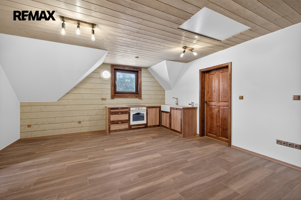 Výstup do 2. NP je samostatný a jsou zde 2 pokoje, prostor s kuchyňským koutem, koupelna s WC a samostatná toaleta.