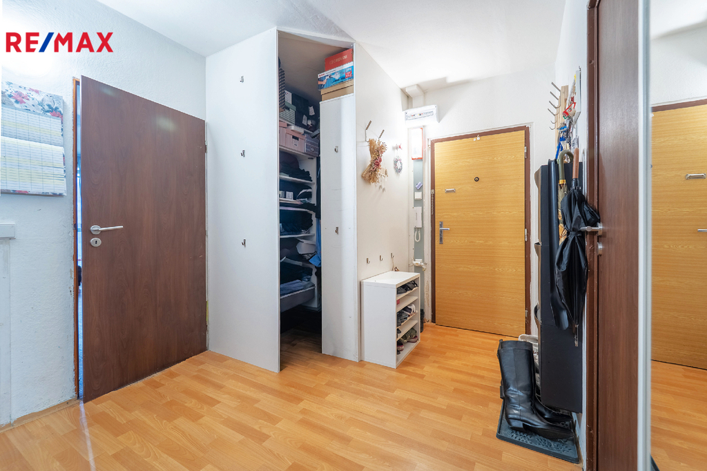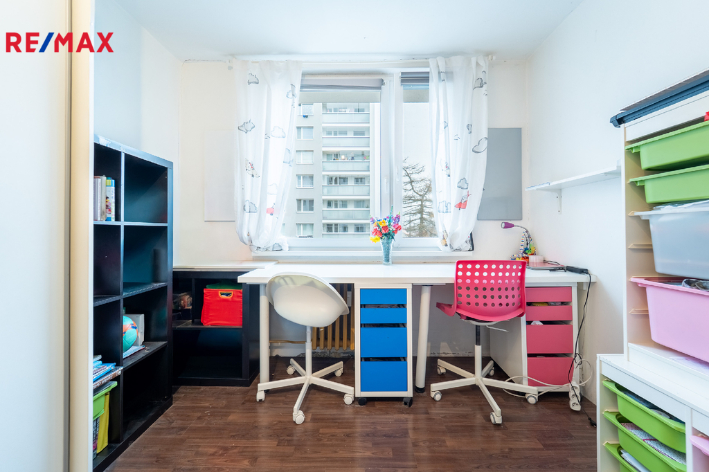 Součástí bytové jednotky je chodba, kde je efektivně využit prostor, zahrnuje šatnu, tři pokoje, samostatnou kuchyň s jídelním koutem, který je nyní využíván, jako pracovna, dále zděné jádro s novou koupelnou, samostatné WC a zasklenou lodžii, která poskytuje ideální místo pro relaxaci a užívání si výhledu do zeleně.