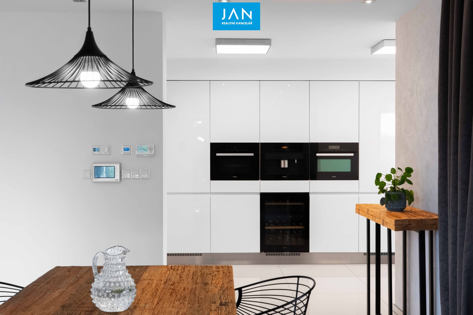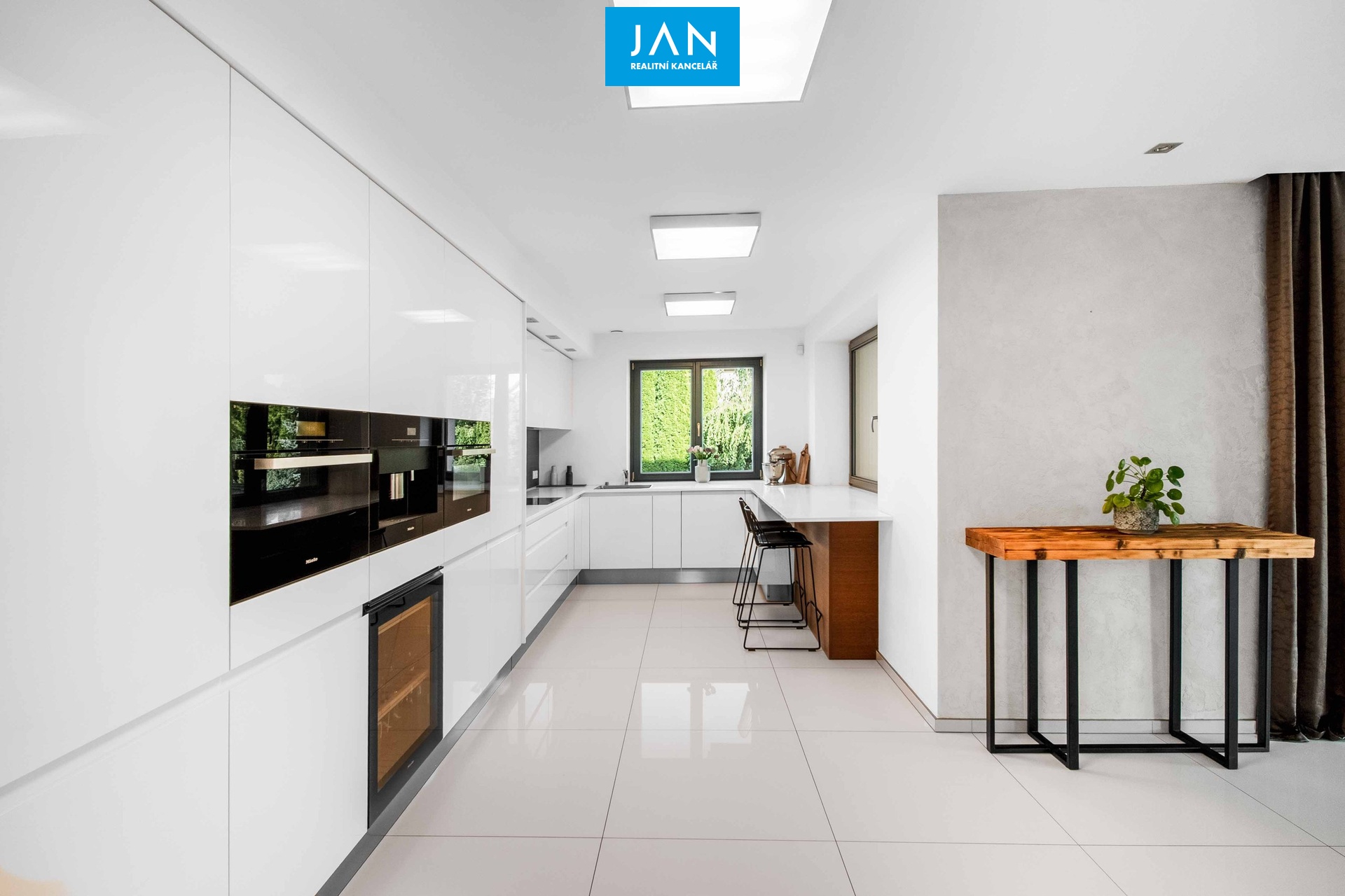 Vstupní chodba, šatna, prostorná hala, pokoj, obývací pokoj s krbem a vstupem na terasu, jídelna, moderní kuchyně se spotřebiči MIELE (lednice, mrazák, myčka, kávovar, indukce, vinotéka, parní i elektrická trouba), koupelna, samostatné WC, komora a technická místnost.
