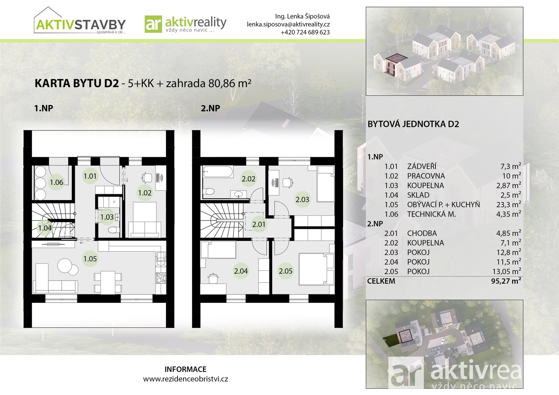 Dispozice domu 5+kk s parkovacím stáním a předzahrádkou - užitná plocha domu je 95,27 m2 a zahrada má výměru 80,86 m2.