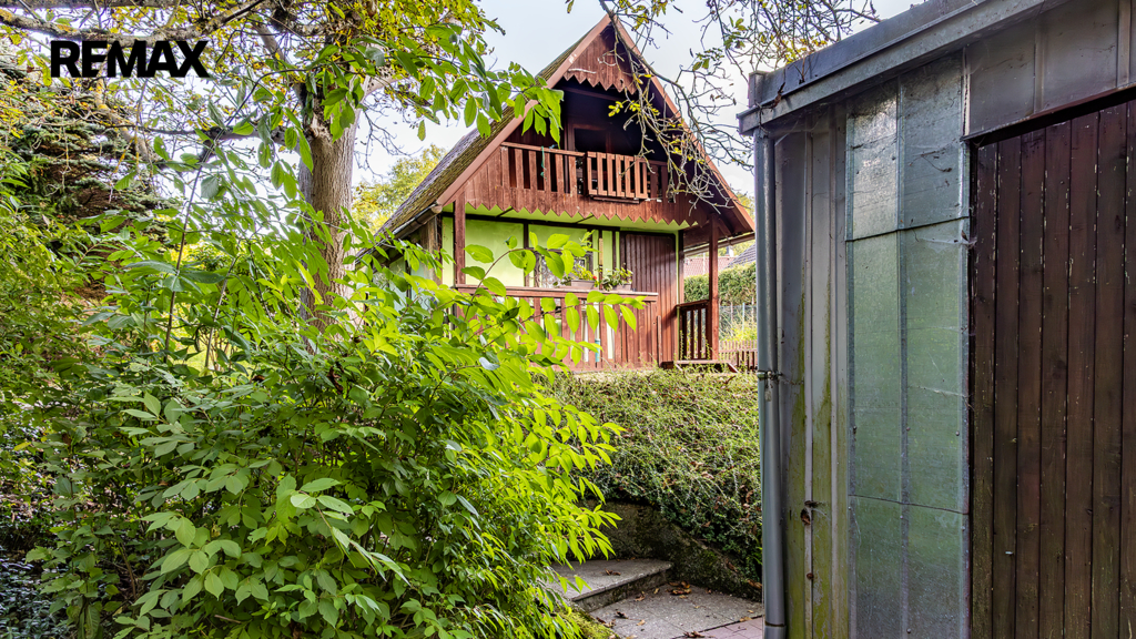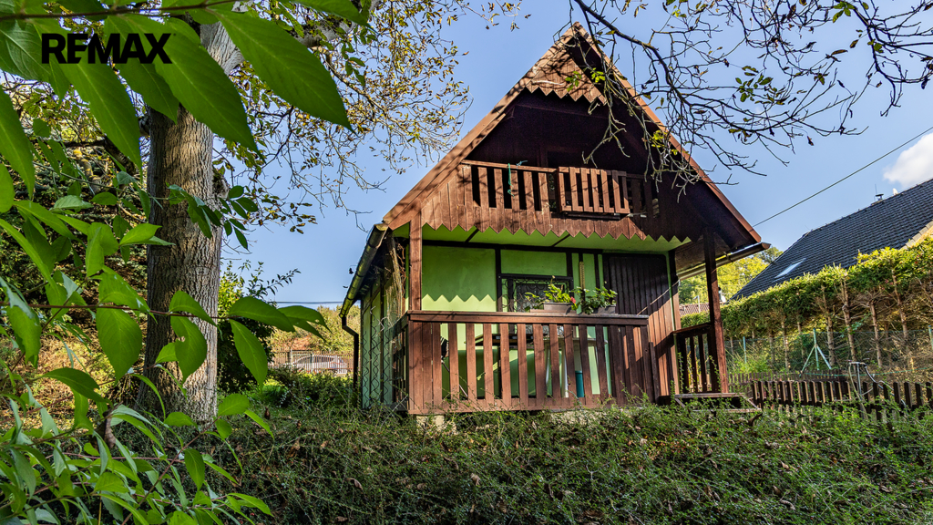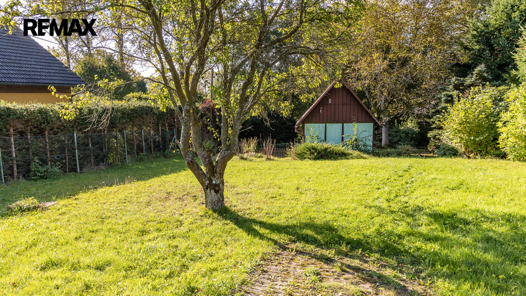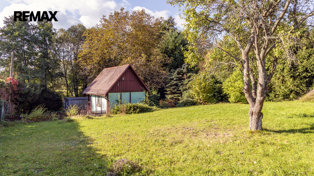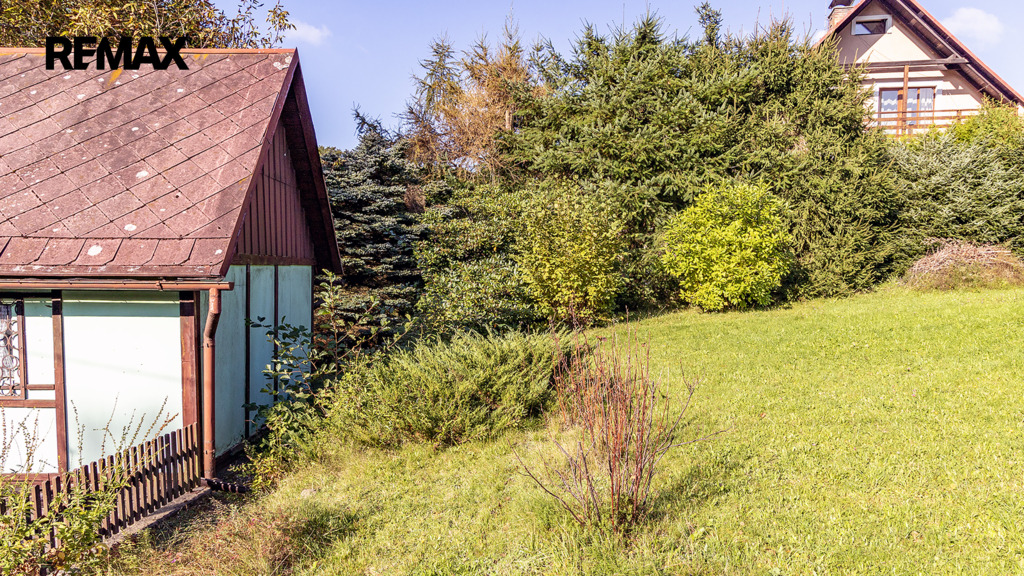 Na pozemku resp. v jeho zadní části v tuto chvíli stojí jednoduchá dřevěná chata (nikoliv na místě předpokládané budoucí stavby RD), která může ještě dál sloužit k občasnému rekreačnímu nebo sezónnímu využití, ale hlavně vám poskytne praktické zázemí během samotné výstavby domu – místo na nářadí, přístřešek při špatném počasí, zázemí pro dohled na stavbu apod.