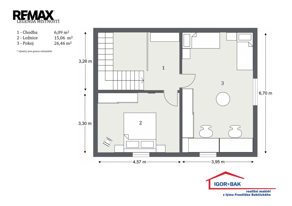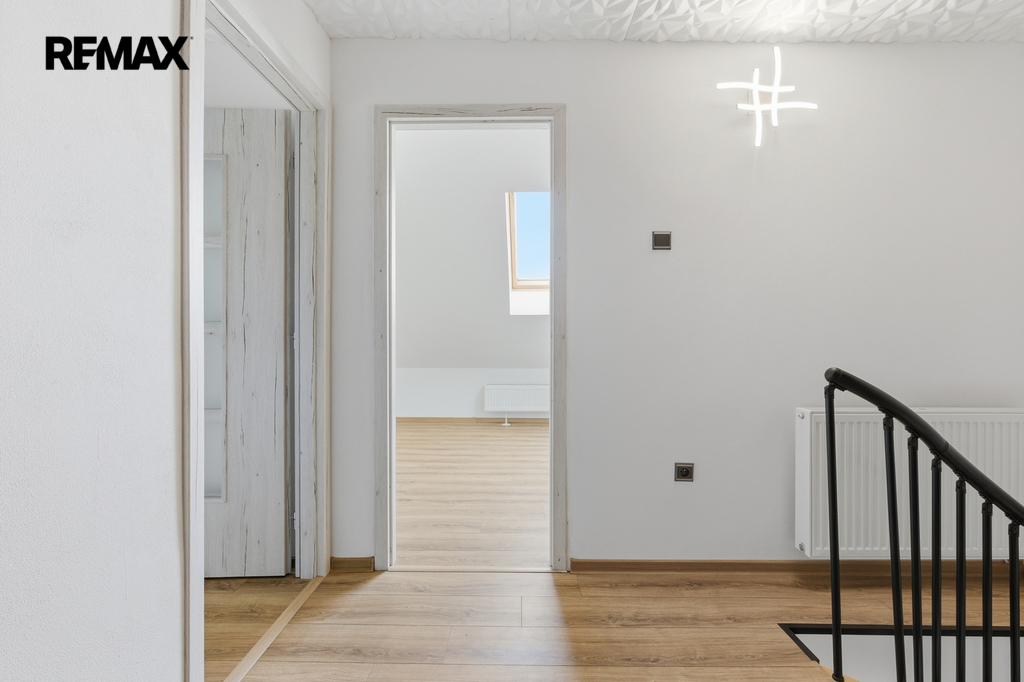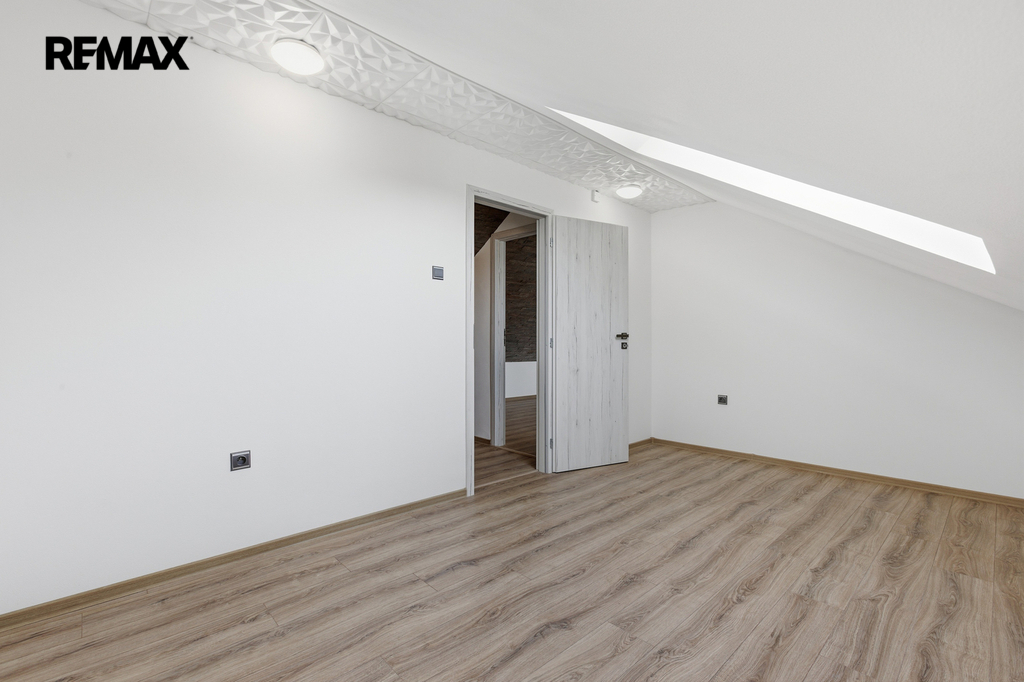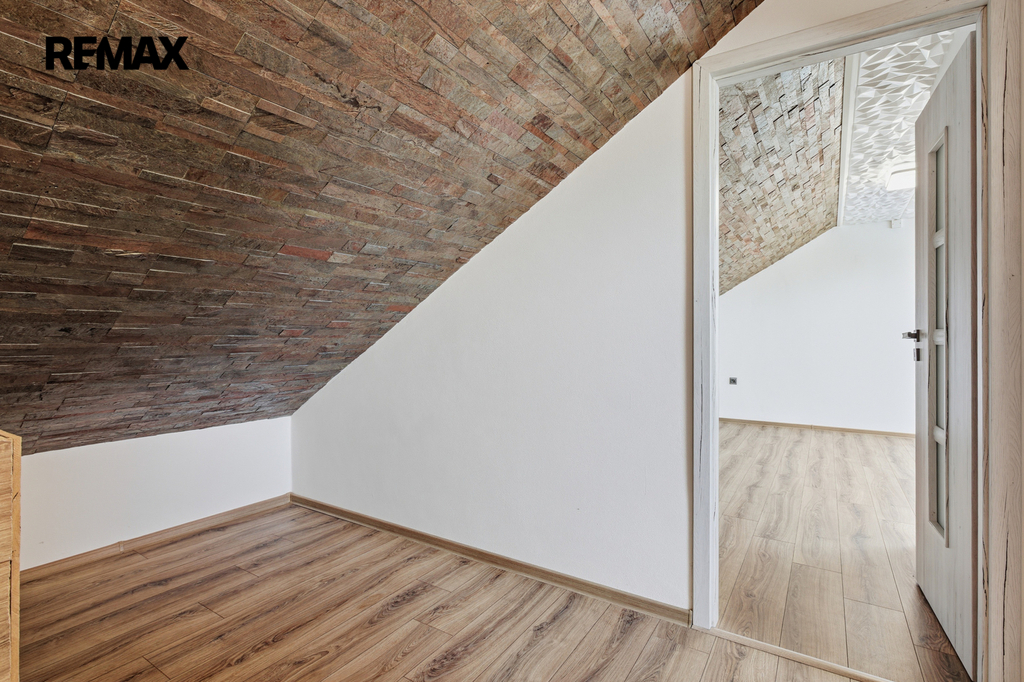 V patře je chodba (5,43 m²), ložnice (15,58 m²) a prostorný pokoj (23,57 m²). Jednotlivé místnosti propojuje točité schodiště.