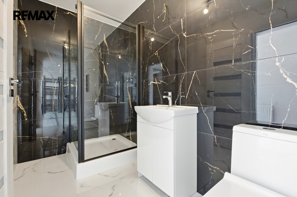 V přízemí najdete předsíň (4,40 m²), koupelnu se sprchovým koutem a toaletou (4,14 m²), kde je použitá velkoformátová, exkluzivní dlažba z vyšší cenové kategorie, dále kuchyni (18,15 m²), obývací pokoj (17,92 m²) a schodiště (8,82 m²).