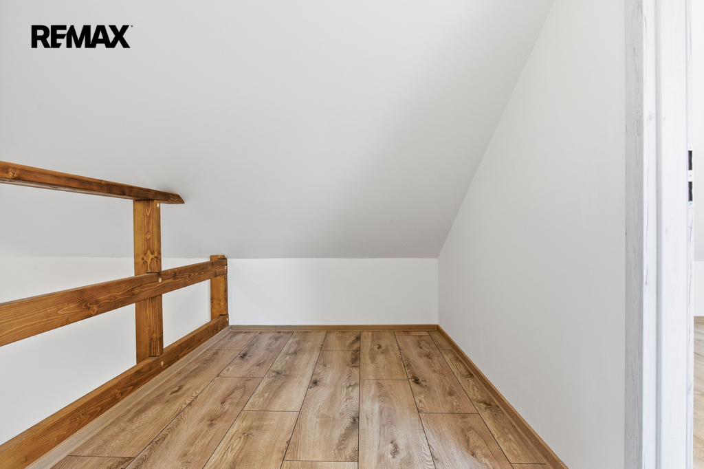 V patře je chodba (6,09 m²), ložnice (15,06 m²) a prostorný pokoj (26,46 m²).