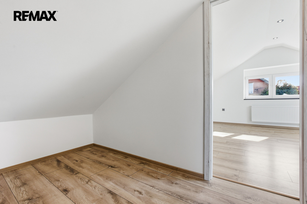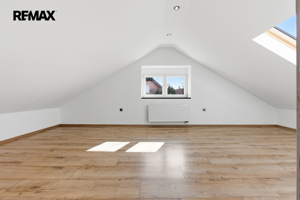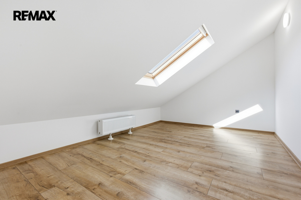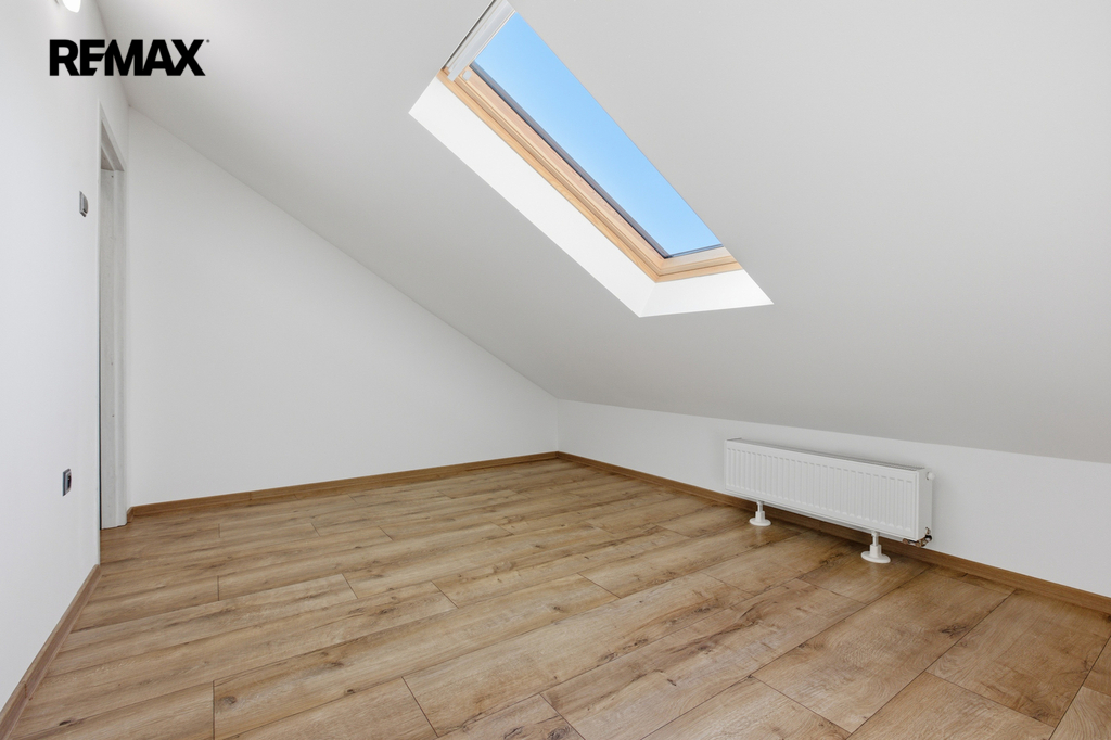 O dostatek světla a tepelný komfort se starají střešní okna Velux s trojsklem (140×90). Vstupní dveře jsou bezpečnostní, připravená je instalace pro kuchyňskou linku i připojení internetu a televize od T-Mobile.