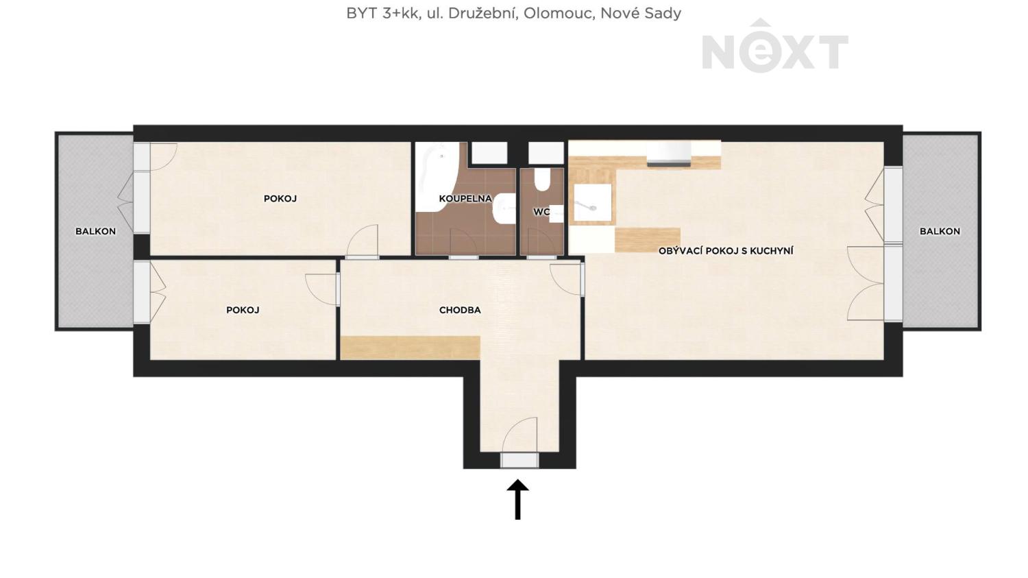 Prostorné zádveří i chodba, neprůchozí pokoje, obě ložnice orientované do klidové zóny, 2 balkony umístěné na opačných stranách bytu pro efektivní větrání, příjemně velká koupelna, samostatné WC. Dispozice bytu vytváří pocit otevřenosti, vzdušnosti a přirozené světlosti.