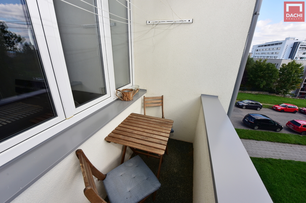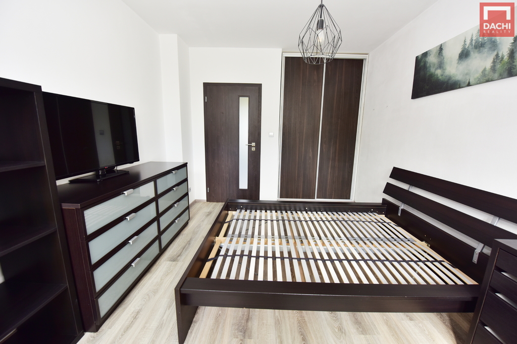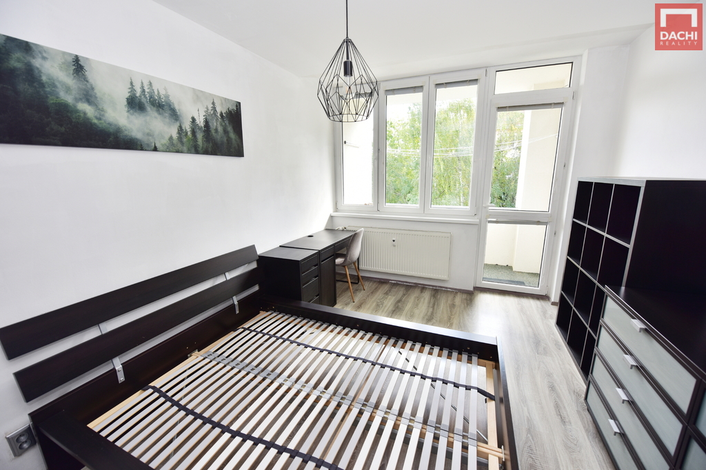 Byt je částečně zařízený – k dispozici je kuchyňská linka včetně spotřebičů, úložné prostory, postel s matrací, sedačka.