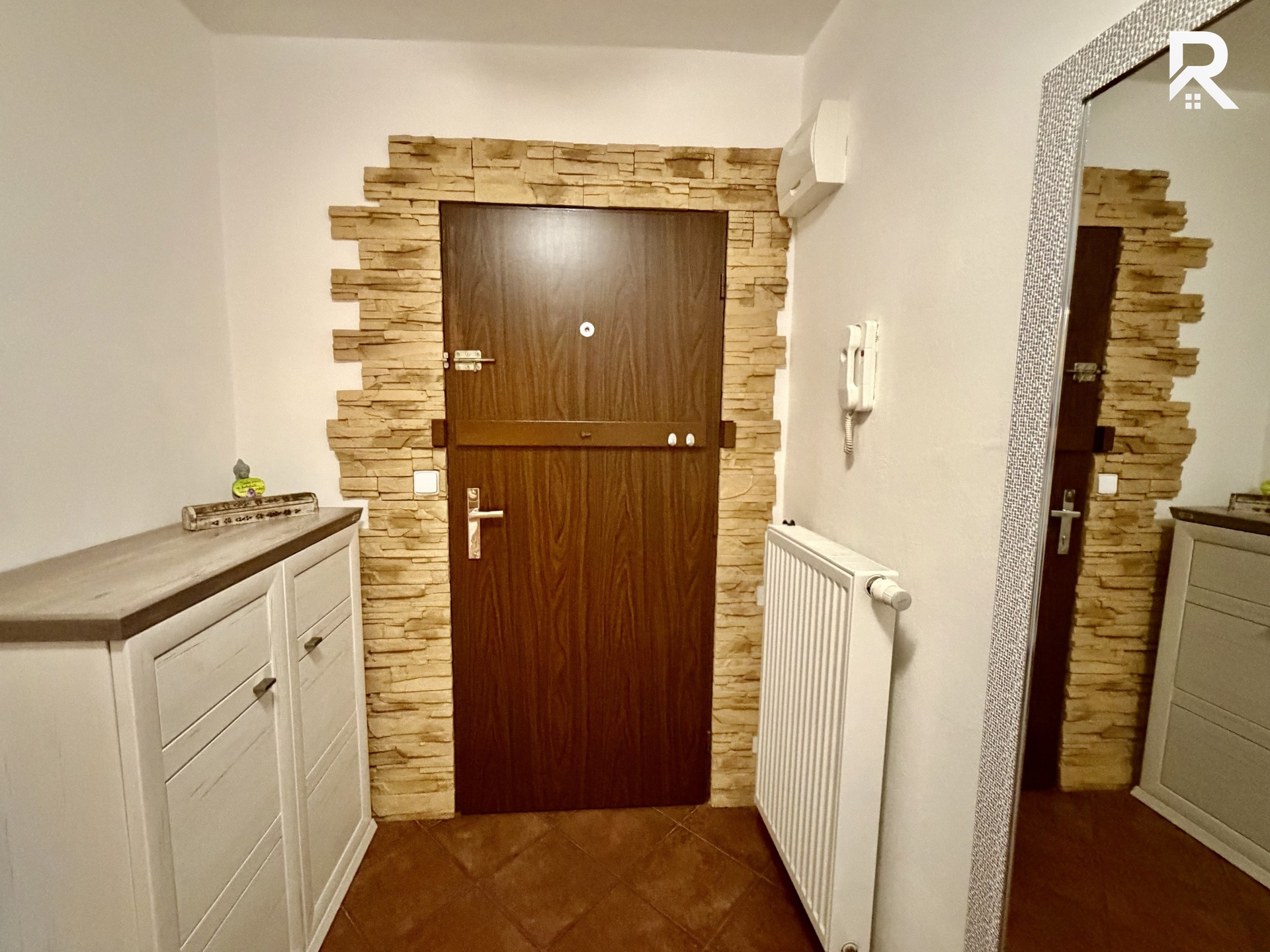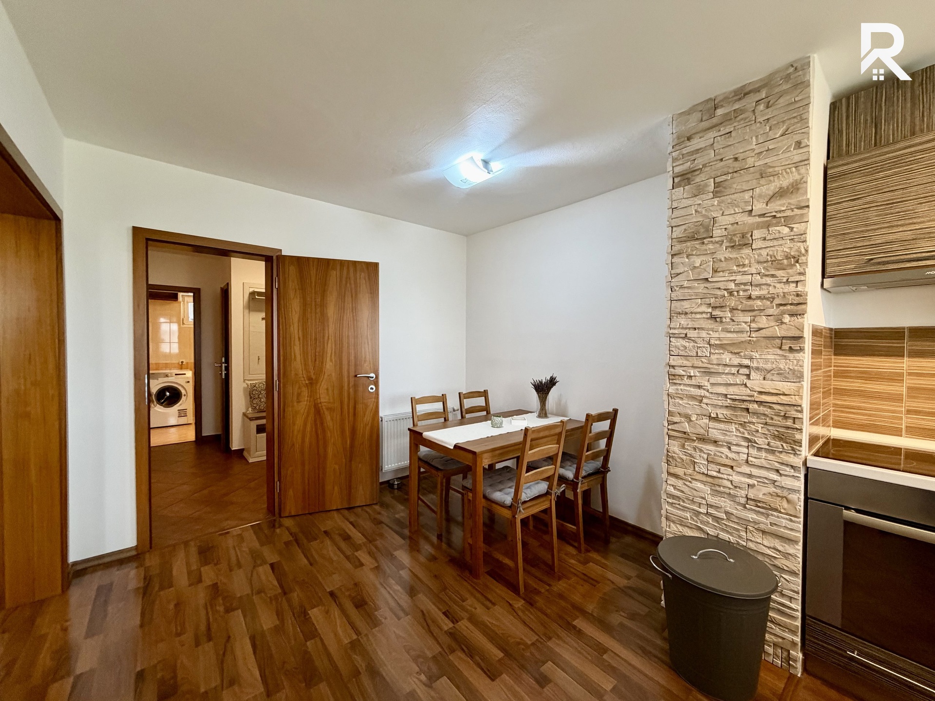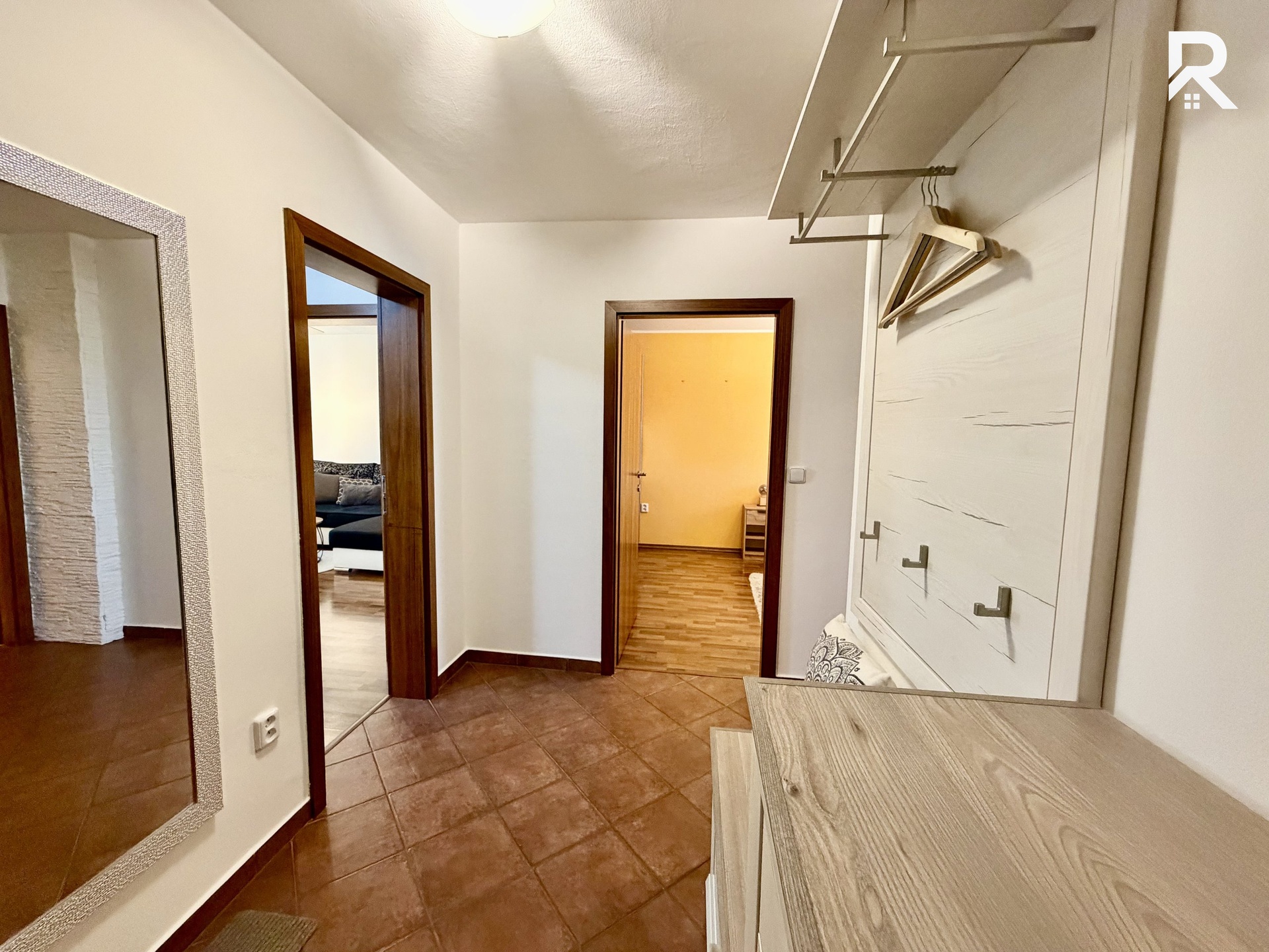 Z hlavní chodby se vchází do tří místností. Do kuchyně a obývacího pokoje, kde je i lodžie. Dále do ložnice s šatní skříní a oknem na východ. Poté do koupelny, kde je vana s integrovaným sprchovým koutem, umývadlo se skříňkami, zrcadlem a místem pro velkou pračku se sušičkou. Z chodby se potom vchází do samostatného WC.