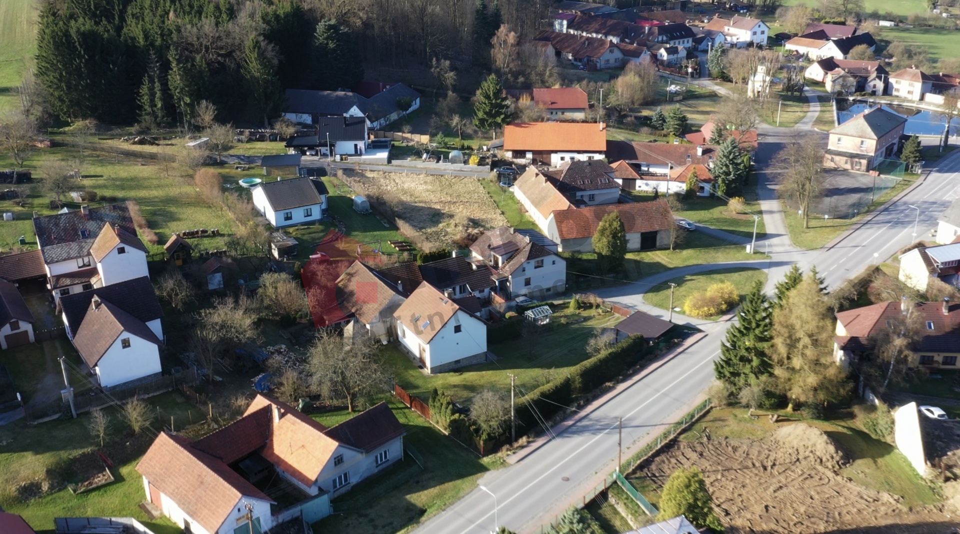 Lokalita - centrum malé obce s výbornou dopravní dostupností. Zastávka autobusu 150 m od pozemku, Pelhřimov 6 km po silnici č. 34