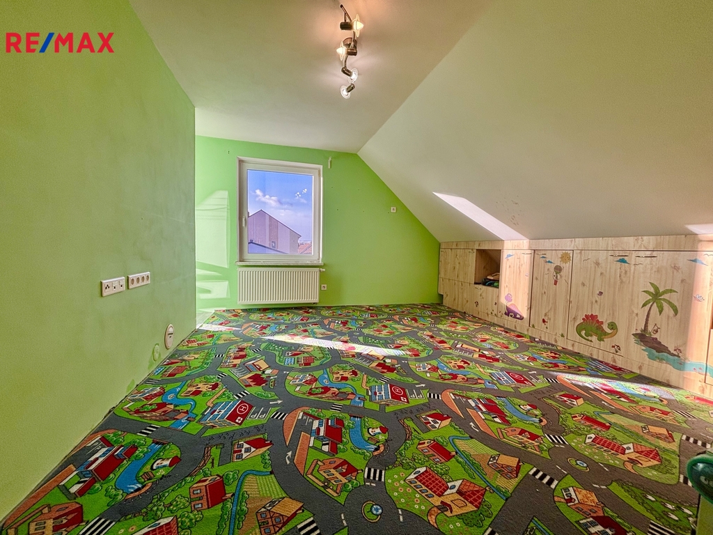První patro: Obývací pokoj s kuchyňským koutem 24 m2, Dětský pokoj 11,86 m2, Ložnice 11,47 m2, Chodba 10,27 m2, Koupelna s WC 3,45 m2, Komora 3,45 m2 s WC a vzniklá Komora nad schodištěm.