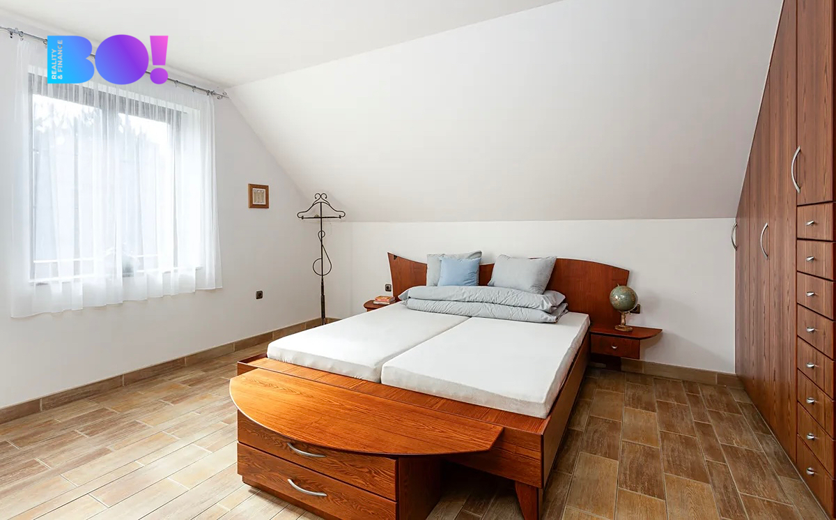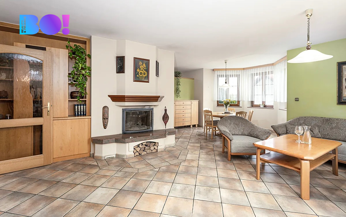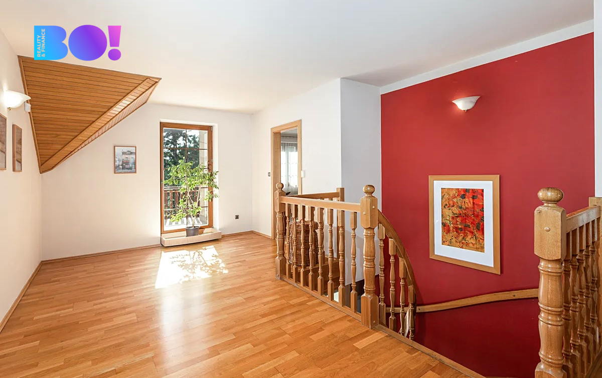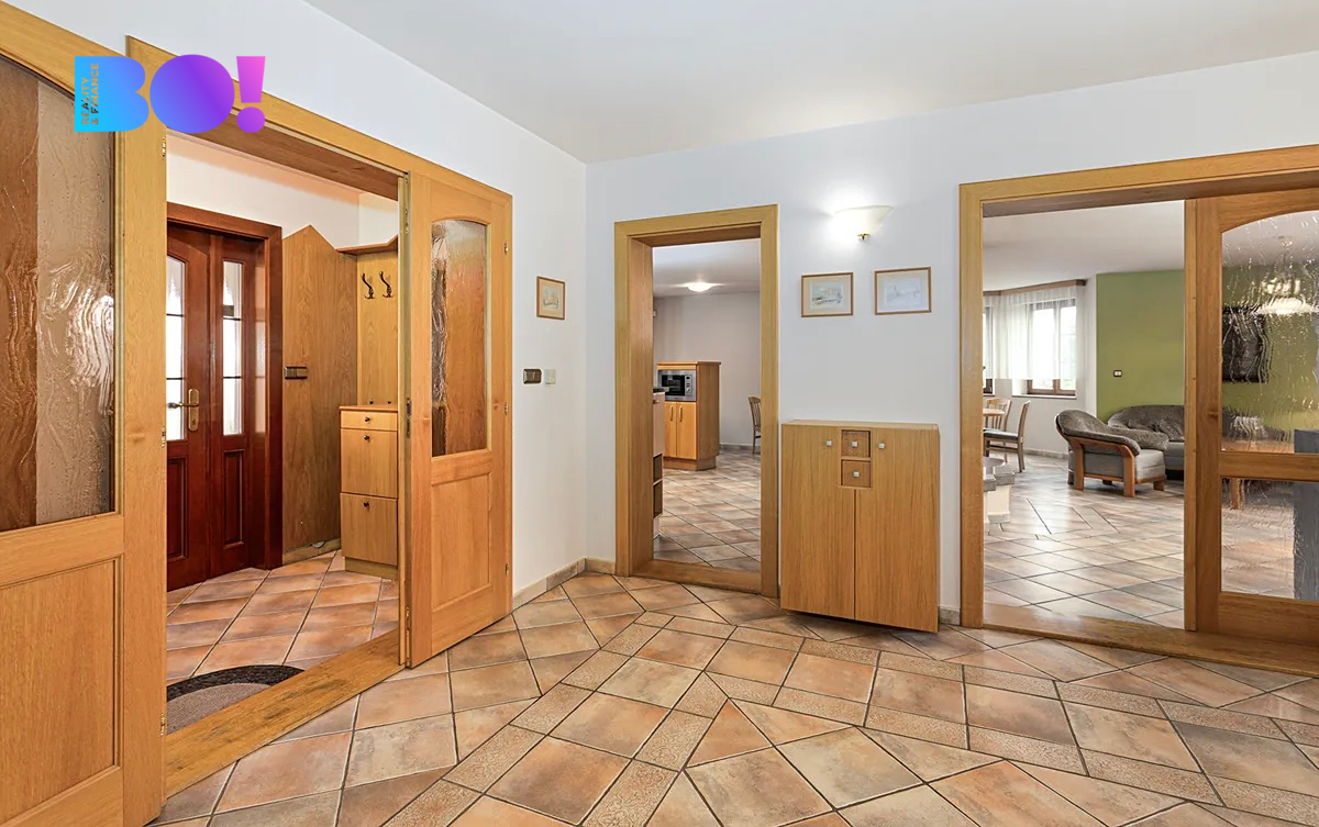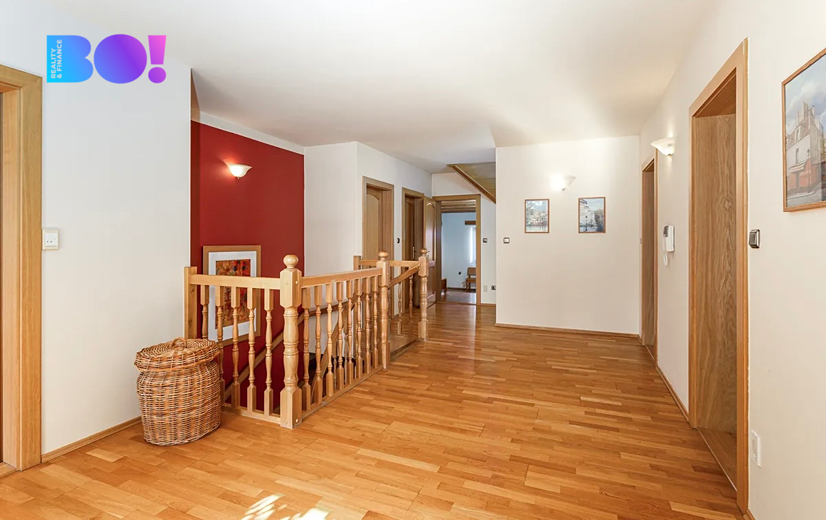 Dům o velikosti 6+kk je ideální jak pro rodinu, tak pro někoho, kdo by chtěl z domu kromě bydlení i pracovat. Užitná plocha domu je 322 m2. V přízemí domu je velká kuchyň s jídelním koutem a obývacím pokojem s krbovou vložkou, zádveří, vstupní hala, technická místnost, pokoj pro hosty, samostatné WC a koupelna. V přízemí domu je rovněž spíž se vstupem do sklepa, garáž a místnost na zahradní potřeby. Výstup na zadní terasu orientovanou na západ je z haly domu.